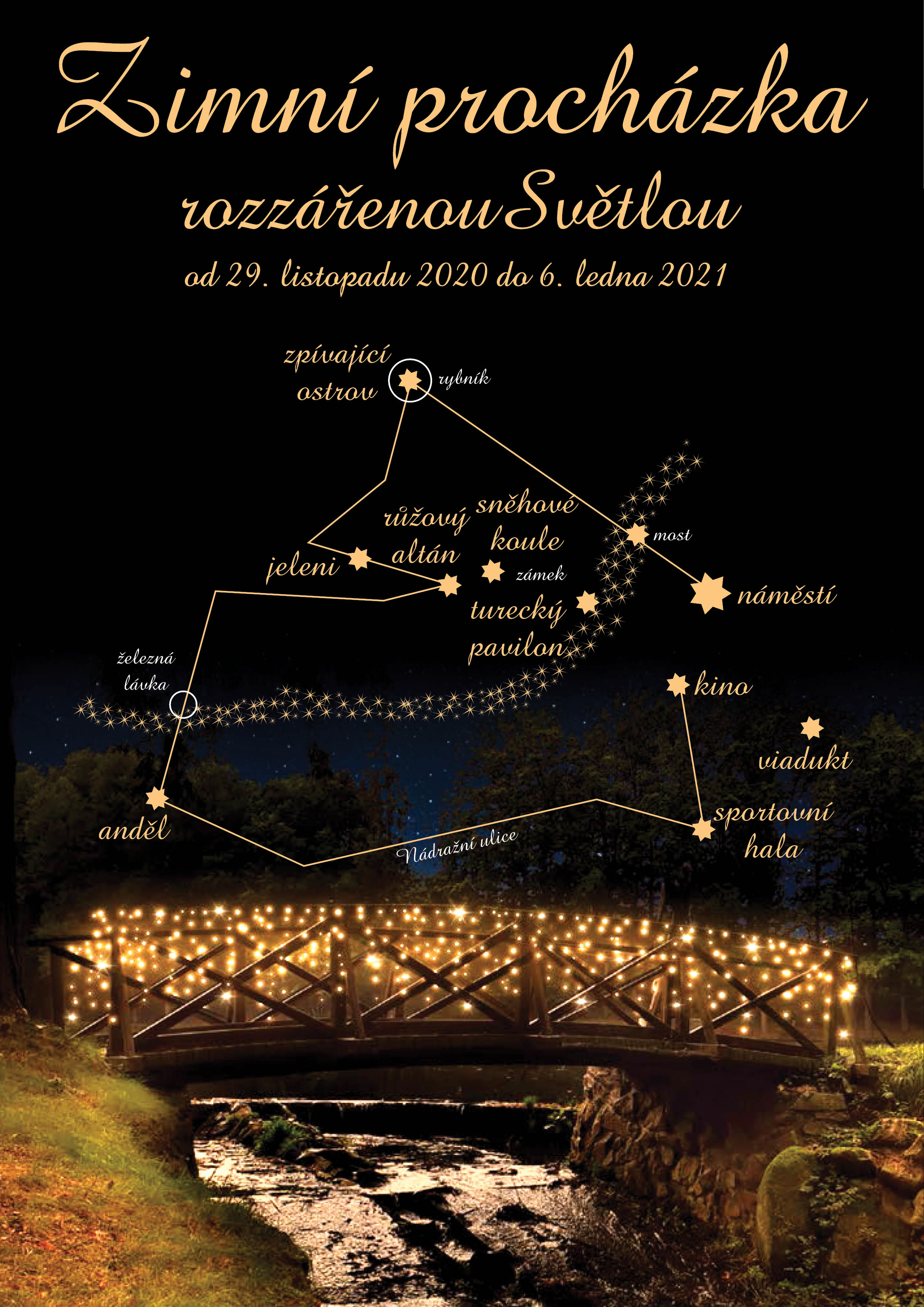 Od první adventní neděle tj. od 29. listopadu můžete vyrazit kdykoliv, nejlépe pak v podvečer, od radnice kolem kašny přes most k prvnímu parkovému rybníku. Abyste si užili světelného efektu, volte soumrak, kdy se rozsvěcejí světla veřejného osvětlení a s ním i sváteční výzdoba. Od půl čtvrté do devíti večer se pravidelně každou půlhodinu z ostrůvku na pár minut ozvou tóny hudby. Odpusťte technickou nedokonalost a zkuste poslouchat nejen ušima, ale především srdcem.