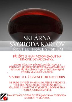 Do řemesla vás zasvětí také Sklárna Karlov, která v sobotu 1. července slaví 30 let svého provozu. Oslavy se neobejdou bez doprovodného programu a hlavně vzpomínek na mistry skláře a doby minulé.