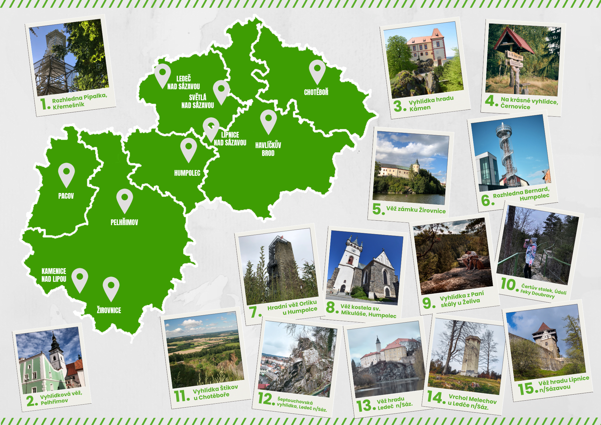 Zdolejte alespoň šest vybraných vrcholů, věží nebo rozhleden a objevte nové pohledy na severozápadní Vysočinu.