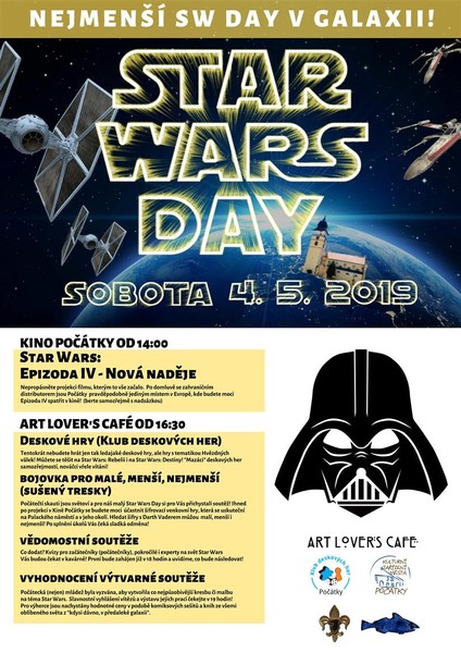 Po celém světě se 4.května slaví Star Wars Day jako den všech fanoušků a příznivců světa Hvězdných válek (StarWars). V České republice byla akce organizována především v Praze a v Brně. Až dosud! 4.května budete moci oslavit Star Wars Day i v Počátkách. Ve 14:00 odstartuje projekcí filmu, kterým to všechno začalo – Star Wars: Epizoda IV: Nová naděje. Dále vás čekají deskovky, bojovky pro malé, menší i nejmenší, vědomostní soutěže.