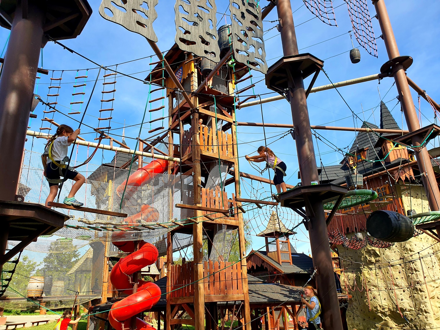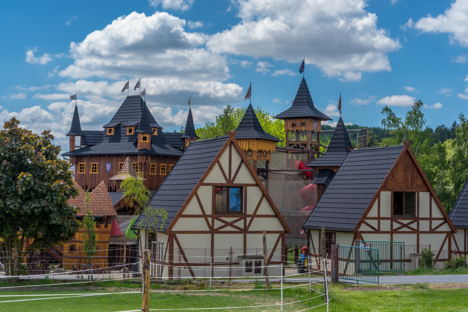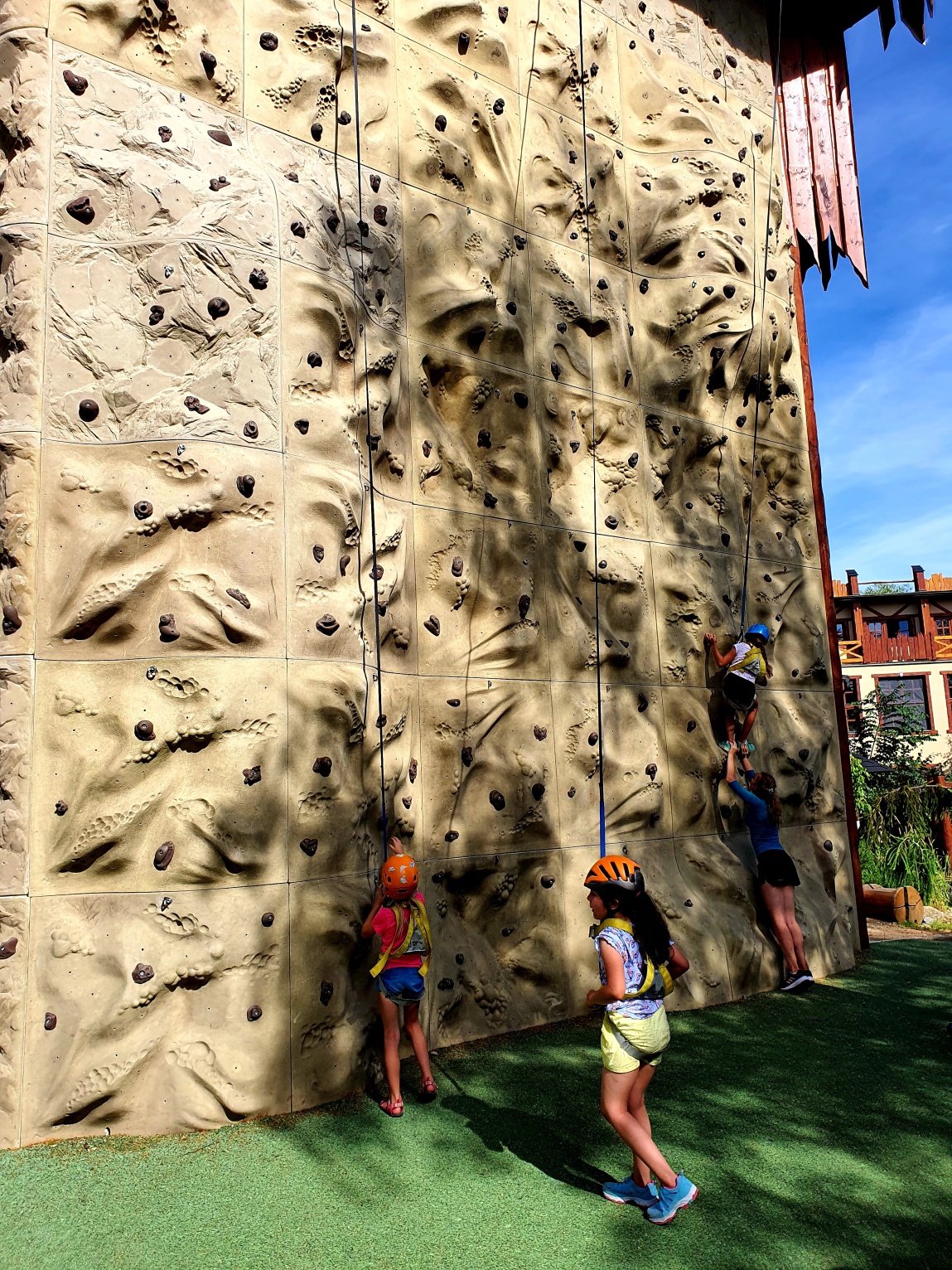 Wenn Sie sich die Fotos und die Liste der Attraktionen ansehen, werden Sie sich insgeheim wünschen, in den Schuhen Ihrer Kinder zu stecken:). Klettergerüste, mittelalterliche Kletterwände, Seilparks, ein Riesentrampolin, eine Kinderburg, ein 4-stöckiges Labyrinth, ein Piratendorf, ein Laserlabyrinth, Schwimmbäder, eine Räuberburg, der Karlstein-Turm und seine schrecklichen Kammern, eine Holzfestung. Alles im Stil einer mittelalterlichen Stadt.