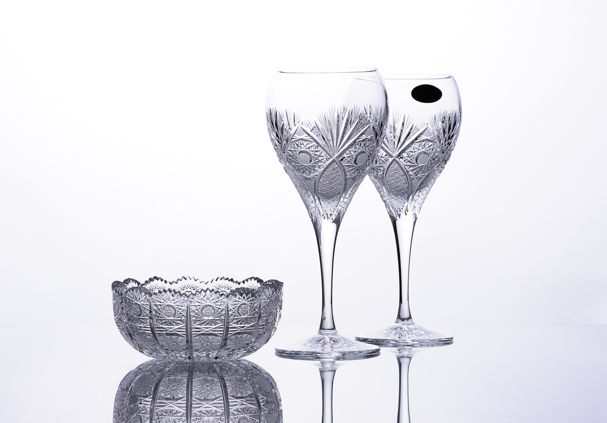 Es bietet eine Fülle von Dekoren und Formen – Vasen, Getränkesets, Biergläser, Glocken und vieles mehr. Alle Produkte gehören zur höchsten Kategorie von geschliffenem Luxusglas Bohemia Crystal.