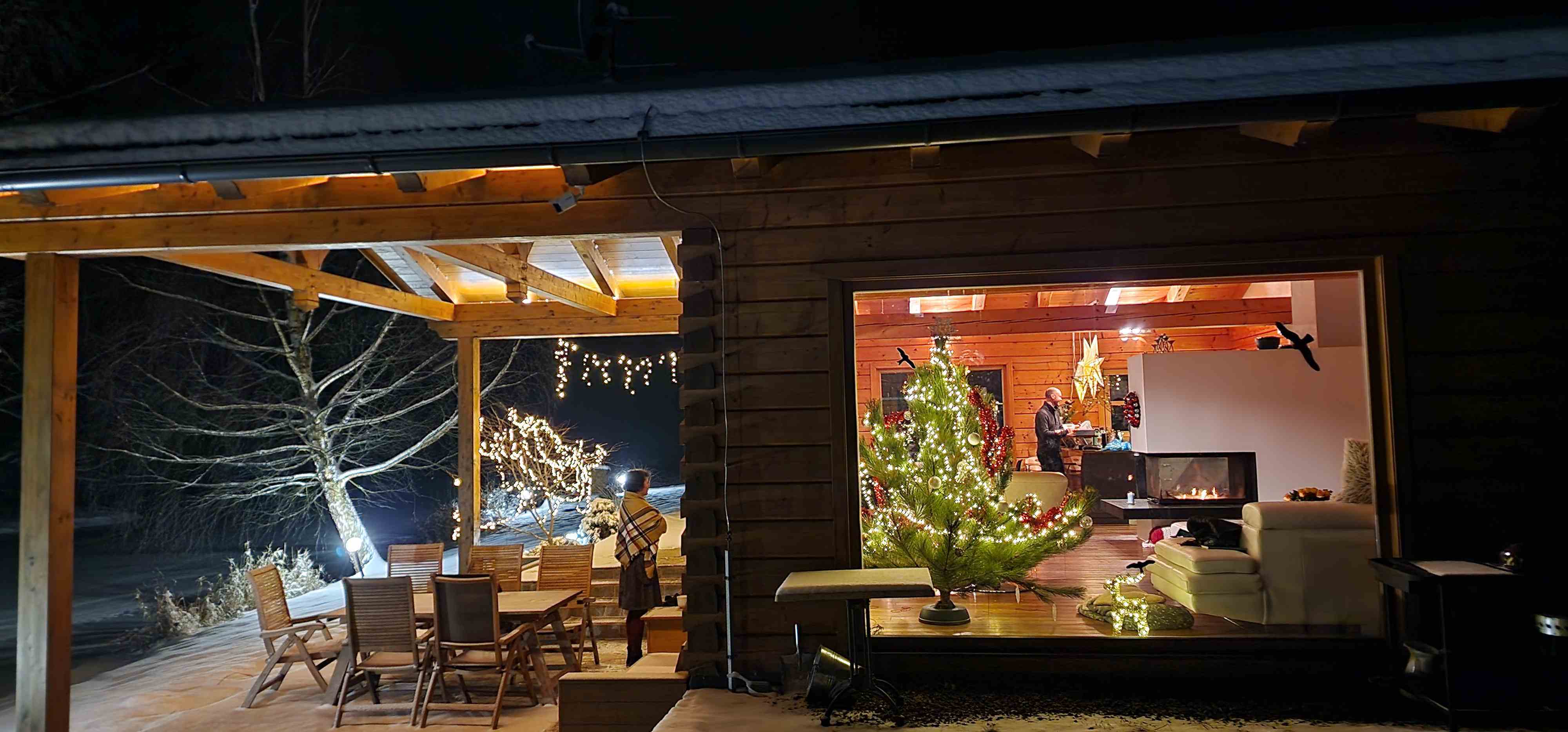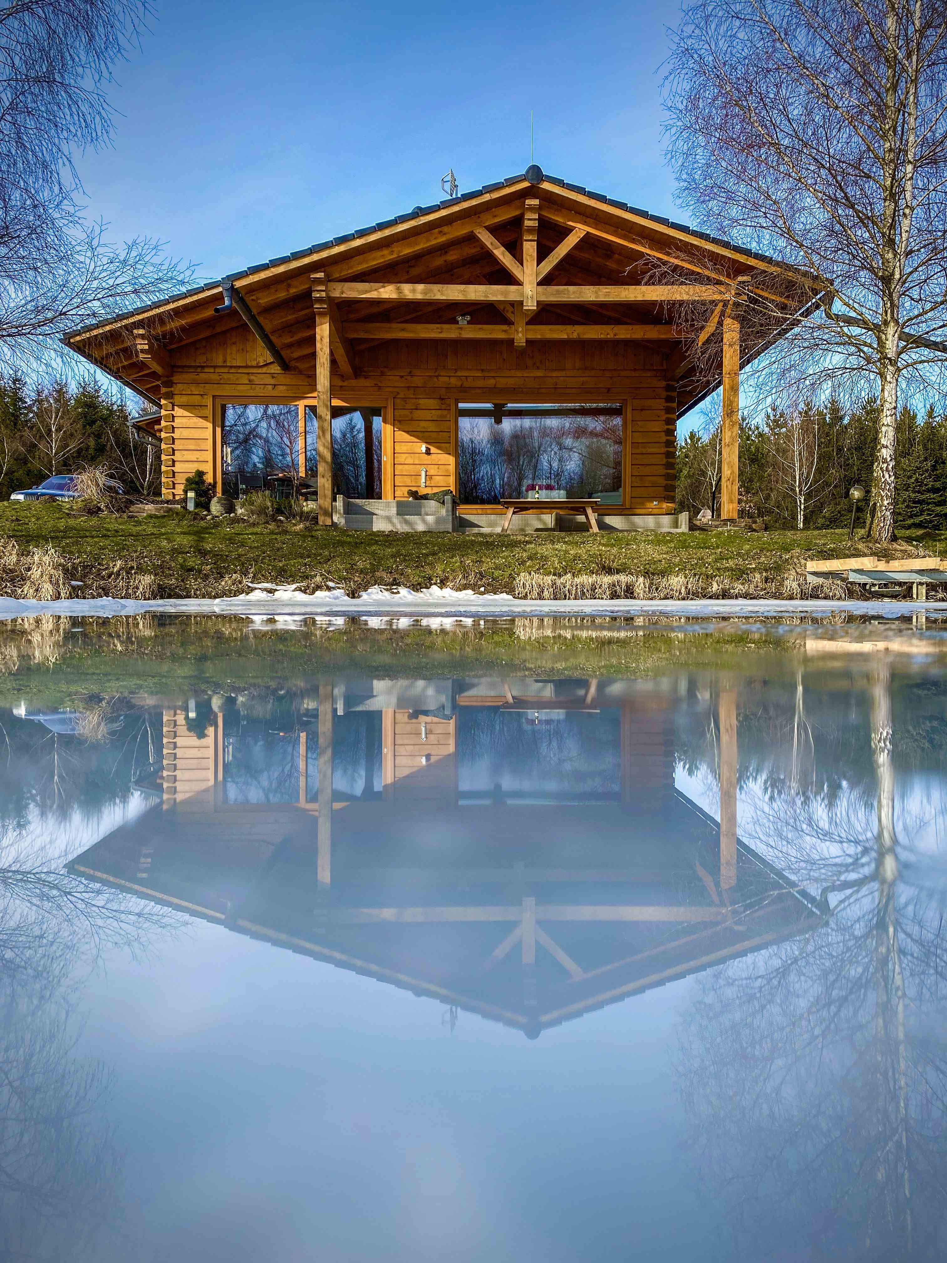 Sie können in einem der beiden Blockhäuser wohnen - entweder im Karolína-Häuschen oder im Wellness-Häuschen. Beide Ferienhäuser haben vom Wohnbereich aus einen schönen Blick auf den Teich und den dahinter liegenden Wald. Sie können auch das gesamte Gelände mieten.
