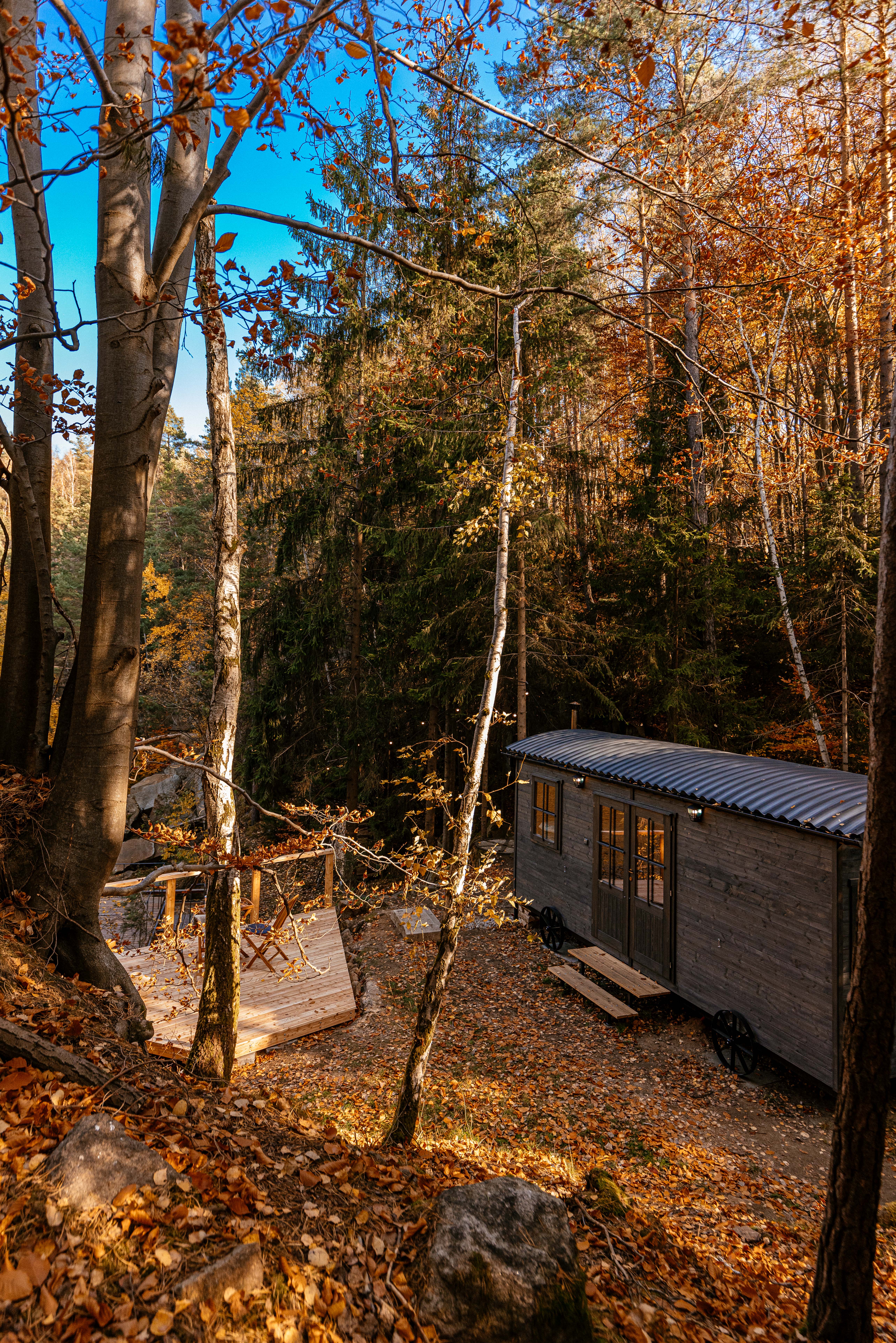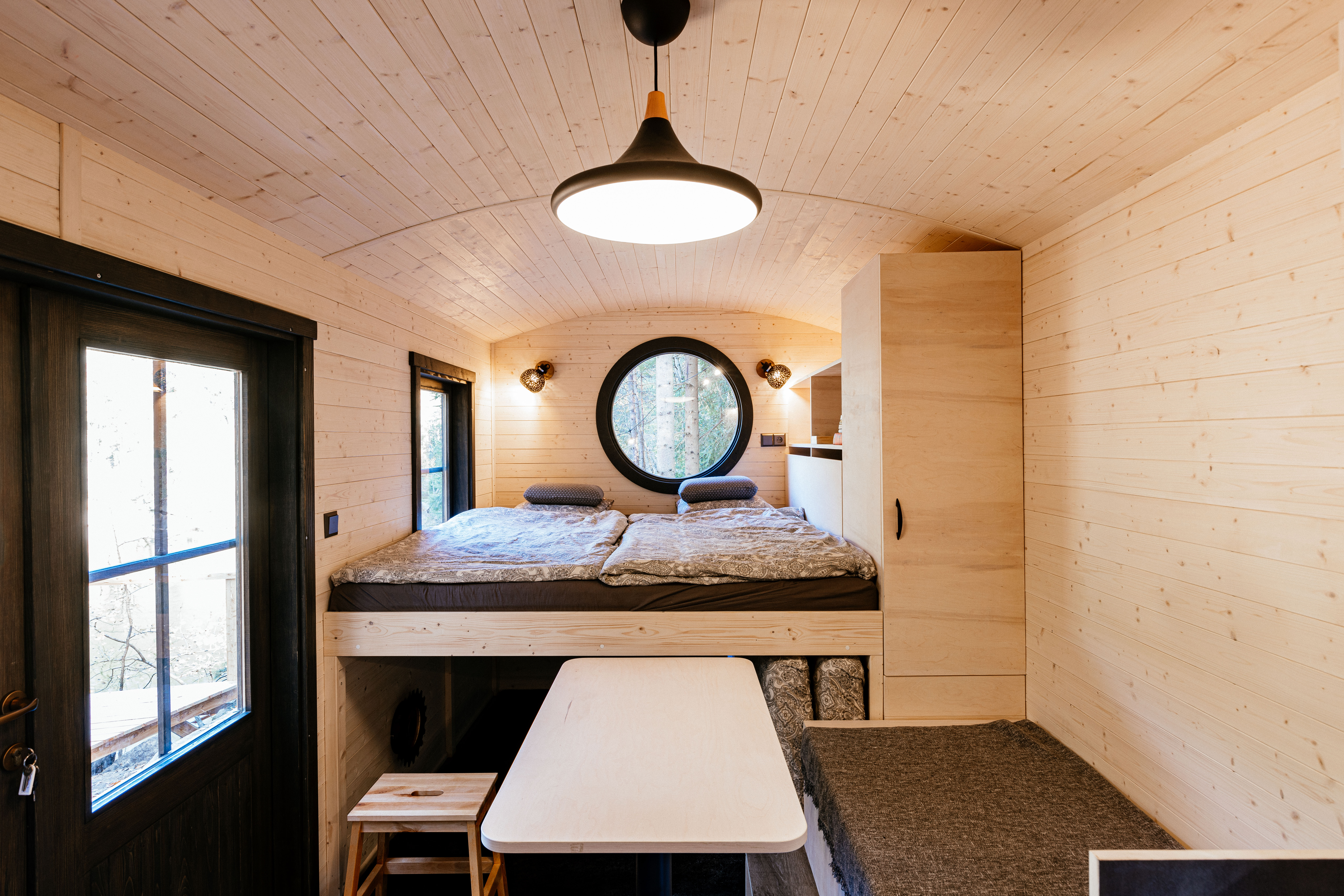 A small cabin on the quarry bank has everything you need - an equipped kitchen, chemical toilet, shower, soft towels, bathrobes and a large bed for two. You won't find an oven or a coffee maker here. But a choice ground coffee and a mocha pot, yes.