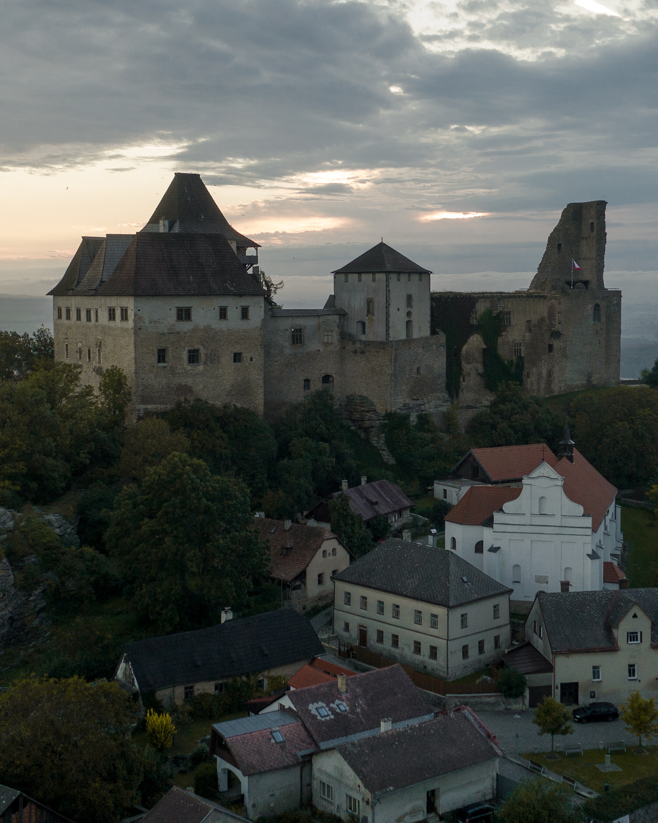 The typice silhouette of the castle is delimited by the large residential Thurnovský and Trčkovský Palaces and a monumental tower, the defensive Large Tower, and the residential Samson Tower with a lookout gallery. A Unixe feature is the gothic church of St. Lawrence, where the first Hussite priests in the Kingdom of Bohemia were ordained.