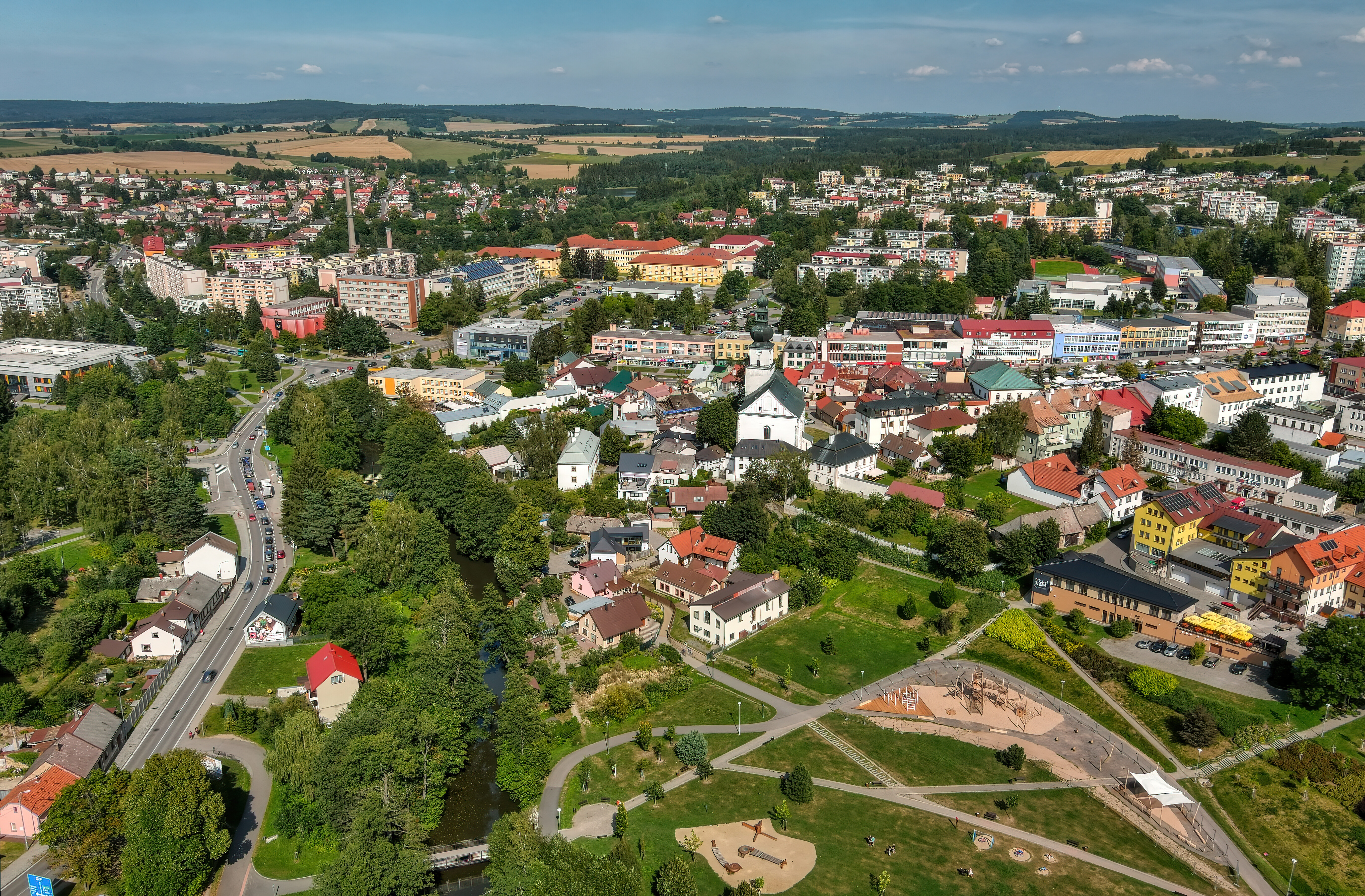 The town of Žďár nad Sázavou lies on the upper Sázava river in the very heart of the Bohemian-Moravian Highlands in the beautiful natural scenery of the Žďárské vrchy Protected Landscape Area.