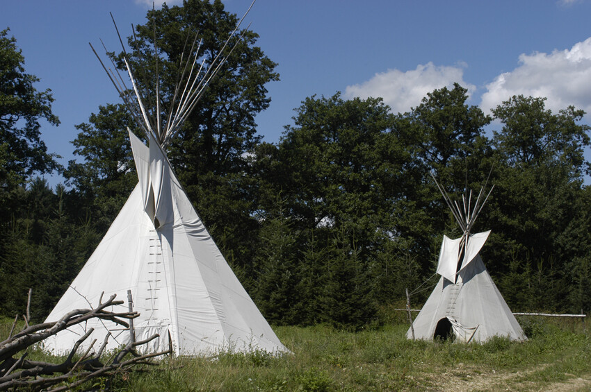 Ubytování v maringotkách pro 20 osob, kuchyňka v „Kanadském srubu“.
