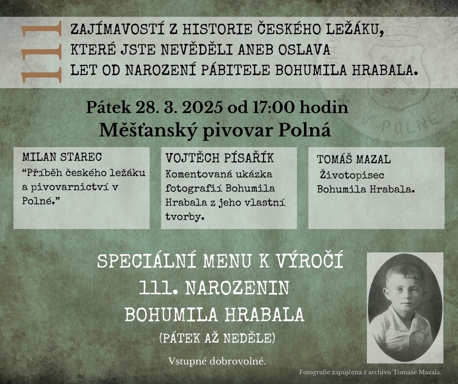 Život Bohumil Hrabala je úzce spjat s našim pivovarem... Cítíme potřebu oslavit 111 let od jeho narození. Připomenout si jeho život díky fotografiím, vzpomínkám... Při této příležitosti ochutnat speciální pokrmy a pivo... Pozvání přijali tři osobnosti, které nám rozhodně budou mít co...