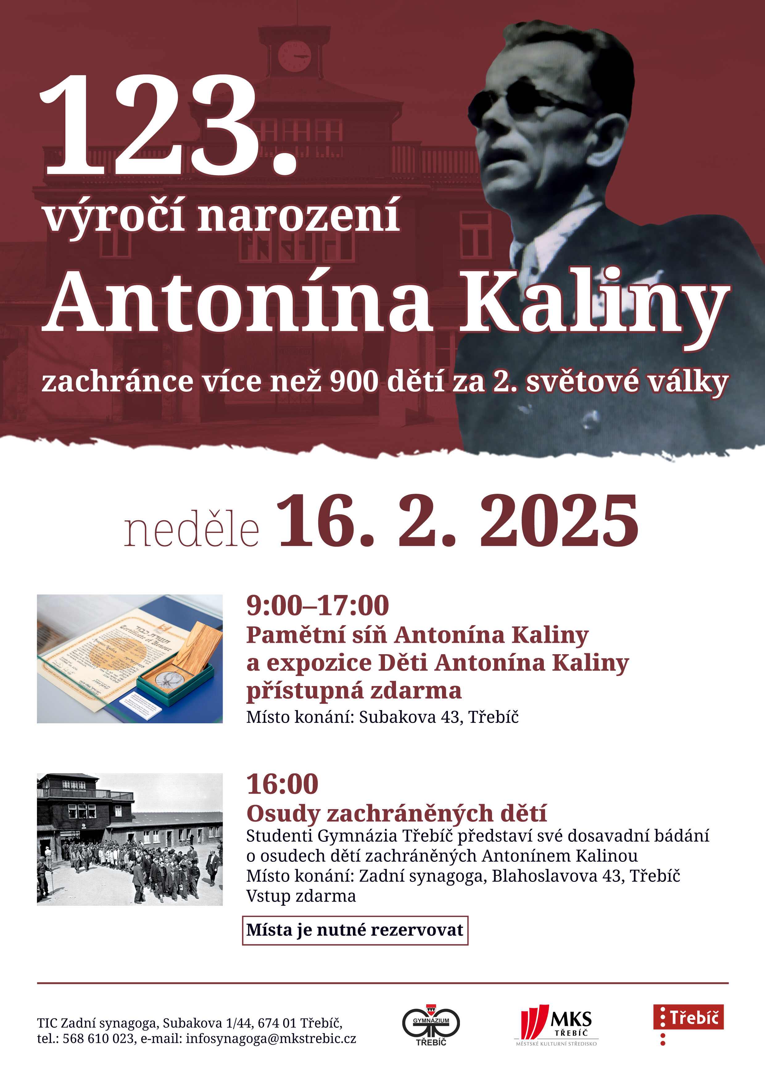 Osudy zachráněných dětí, tak zní název programu, který si pro širokou veřejnost připravili studenti Gymnázia Třebíč. „Pravidelný návštěvník akcí v Zadní synagoze jistě zpozorní a dojde mu, že se nejedná o první představení bádání o zachráněných dětech," zmiňuje trochu tajemně pracovník TIC Zadní synagoga Jakub Kotas. Poprvé byly osudy 36 chlapců představeny v rámci výstavy Antonín Kalina a děti Buchenwaldu, která se v Třebíči uskutečnila od února do června 2024. Zda se v projektech třebíčských gymnazistů událo něco nového, to mohou zájemci zjistit 16. února 2025 od 16:00 v Zadní synagoze. Vstup je zdarma, ale místo je nutné si rezervovat na uvedených kontaktech. Ve stejný den bude zdarma zpřístupněna Pamětní síň Antonína Kaliny a expozice Děti Antonína Kaliny. Návštěvníci, kteří se chtějí dozvědět o celém Kalinově příběhu, mohou do těchto prostor zavítat v otevírací době 9:00-17:00.