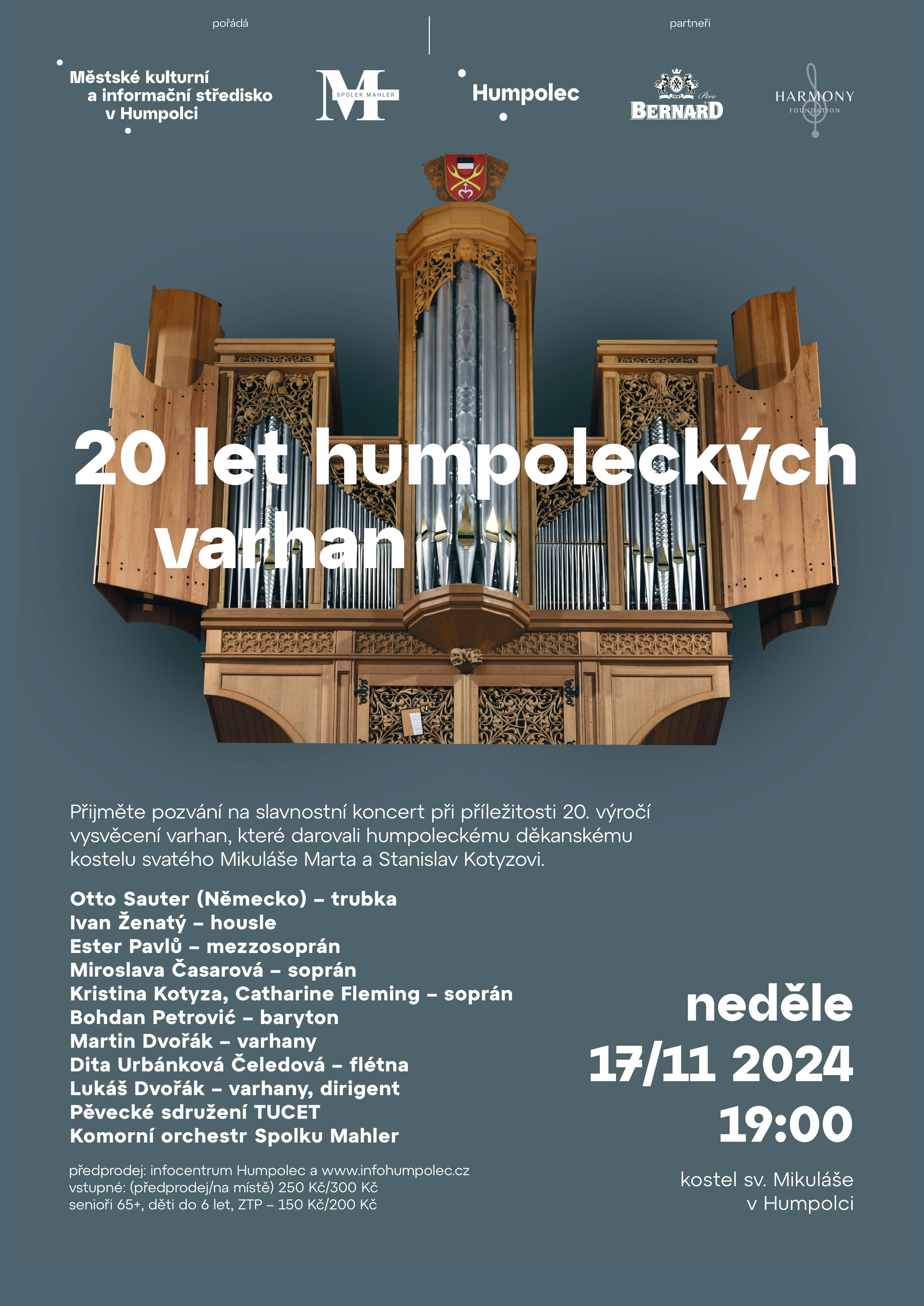 Přijměte pozvání na slavnostní koncert při příležitosti 20. výročí vysvěcení varhan, které darovali humpoleckému děkanskému kostelu svatého Mikuláše Marta a Stanislav Kotyzovi.