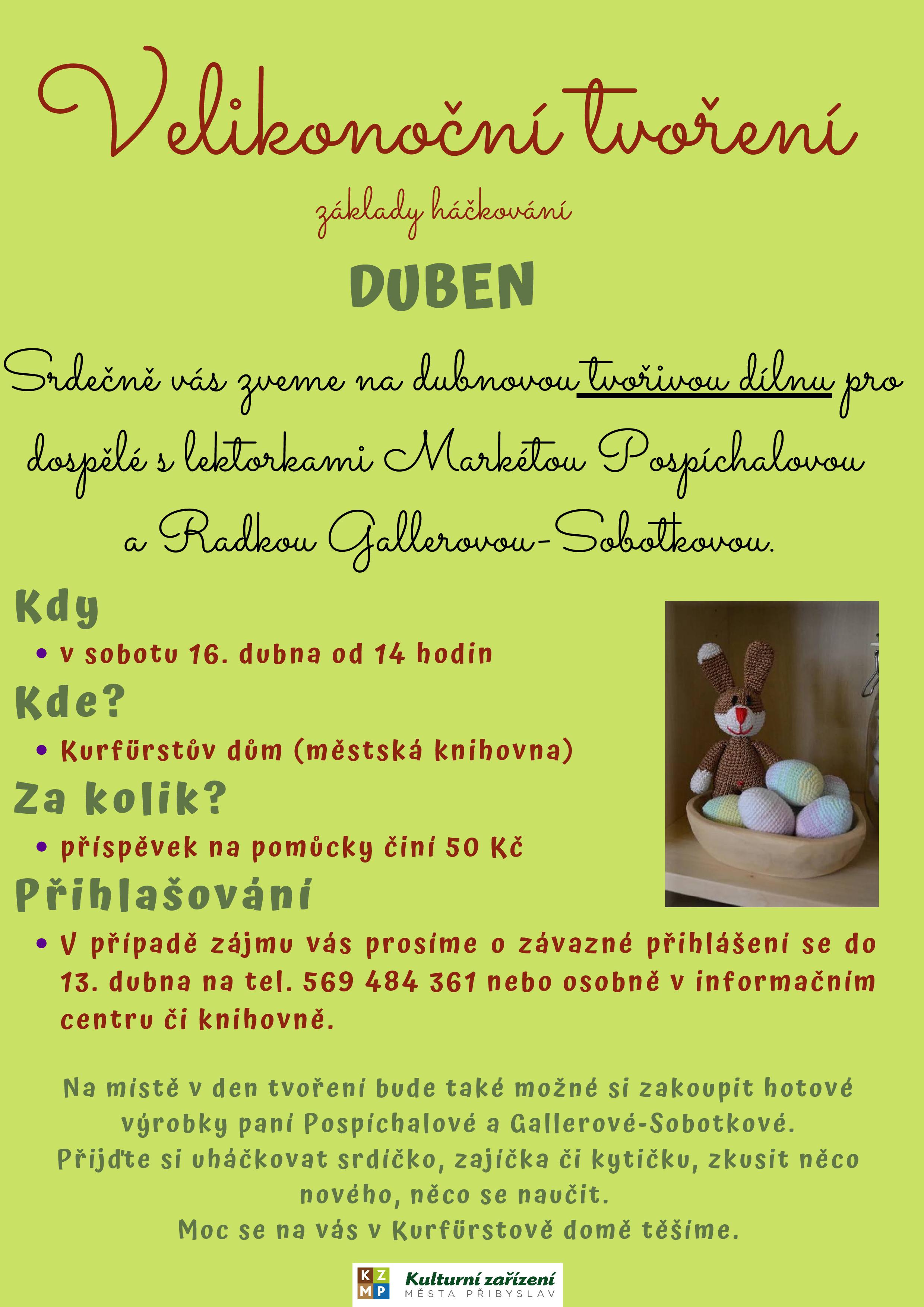 Srdečně Vás zveme na dílnu pro dospělé, kde se tentokrát budeme věnovat základu háčkování. Přijďte si zkusit něco nového a odnést si hezkou velikonoční dekoraci. Na všechny se těšíme v sobotu 16. dubna od 14.00 hodin. Přihlašovat se můžete do 13. 4. a příspěvek na pomůcky činí 50 Kč. Na všechny se těšíme :-)