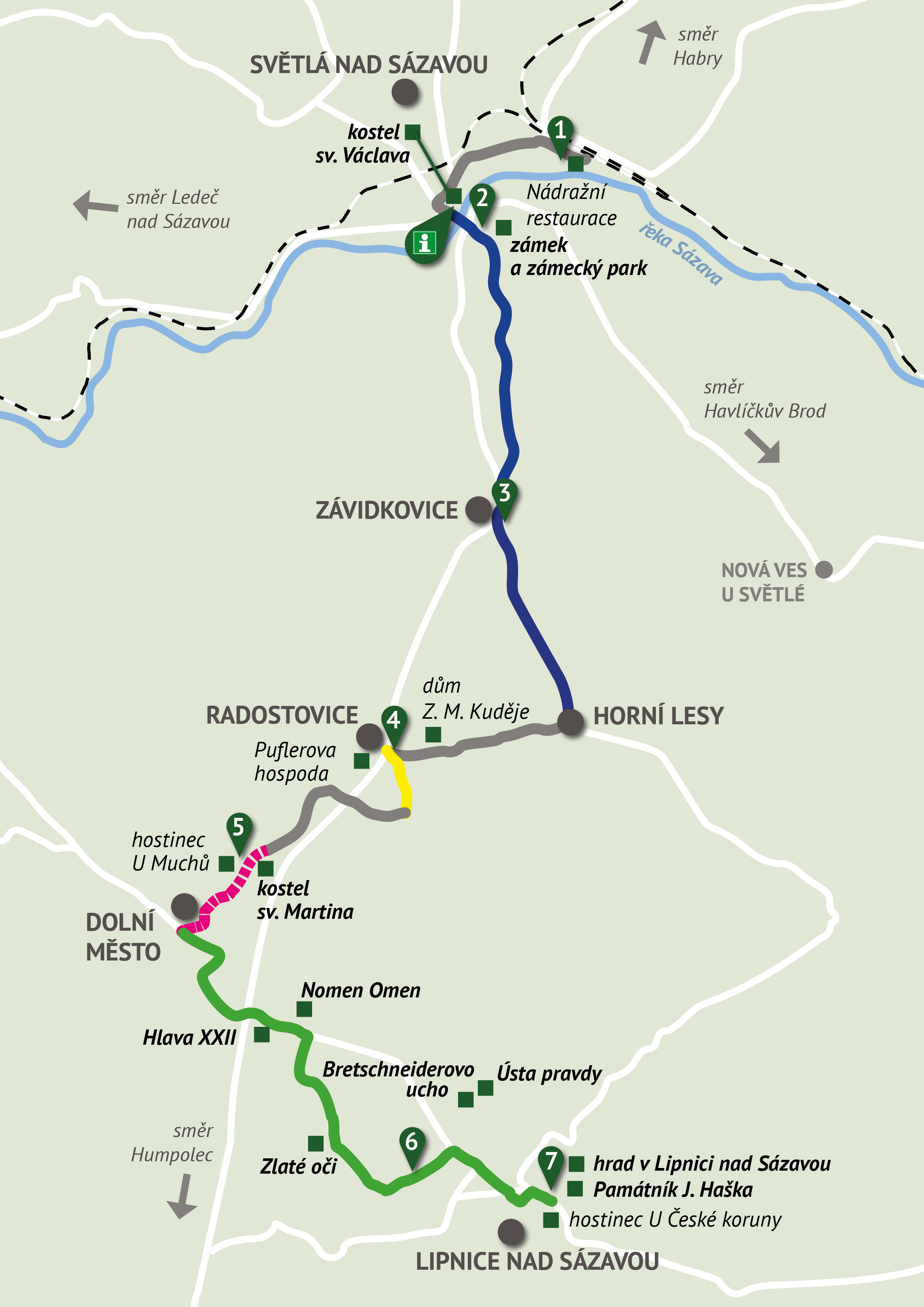 Kudy půjdete: Světlá nad Sázavou – Závidkovice – Horní Lesy – Radostovice – Dolní Město – Lipnice nad Sázavou