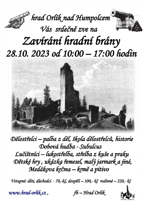Sezóna na hradě Orlík nad Humpolcem pomalu končí, ale my pro Vás připravujeme ještě jednu akci a tou bude 2 ročník „Zavíraní hradní brány" a to poslední říjnový víkend 28. - 29. října 2023. , který jsme věnovali palným zbraním – dělostřelcům , lučištníkům a chladným zbraním.