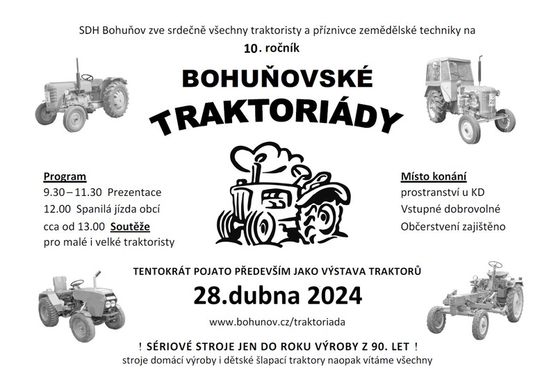 Po roce Vás srdečně zveme na již 10. ročník tradiční bohuňovské traktoriády.