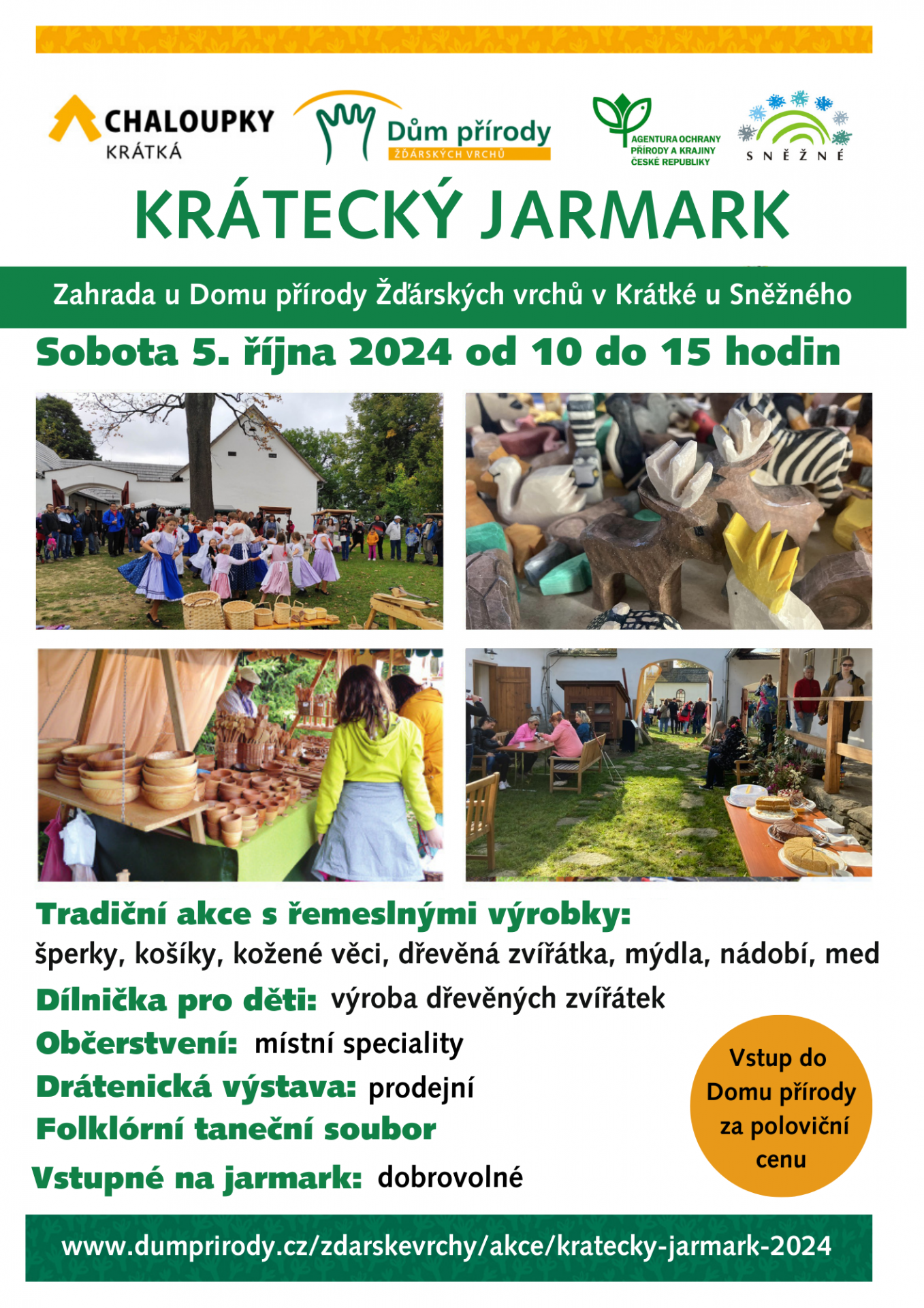 … dřevěných zvířátek Občerstvení: místní speciality Prodejní drátenická výstava Folklórní taneční soubor Vstupné na jarmark je dobrovolné. Během trvání Kráteckého jarmarku je vstup do Domu přírody Žďárských vrchů za poloviční cenu.
