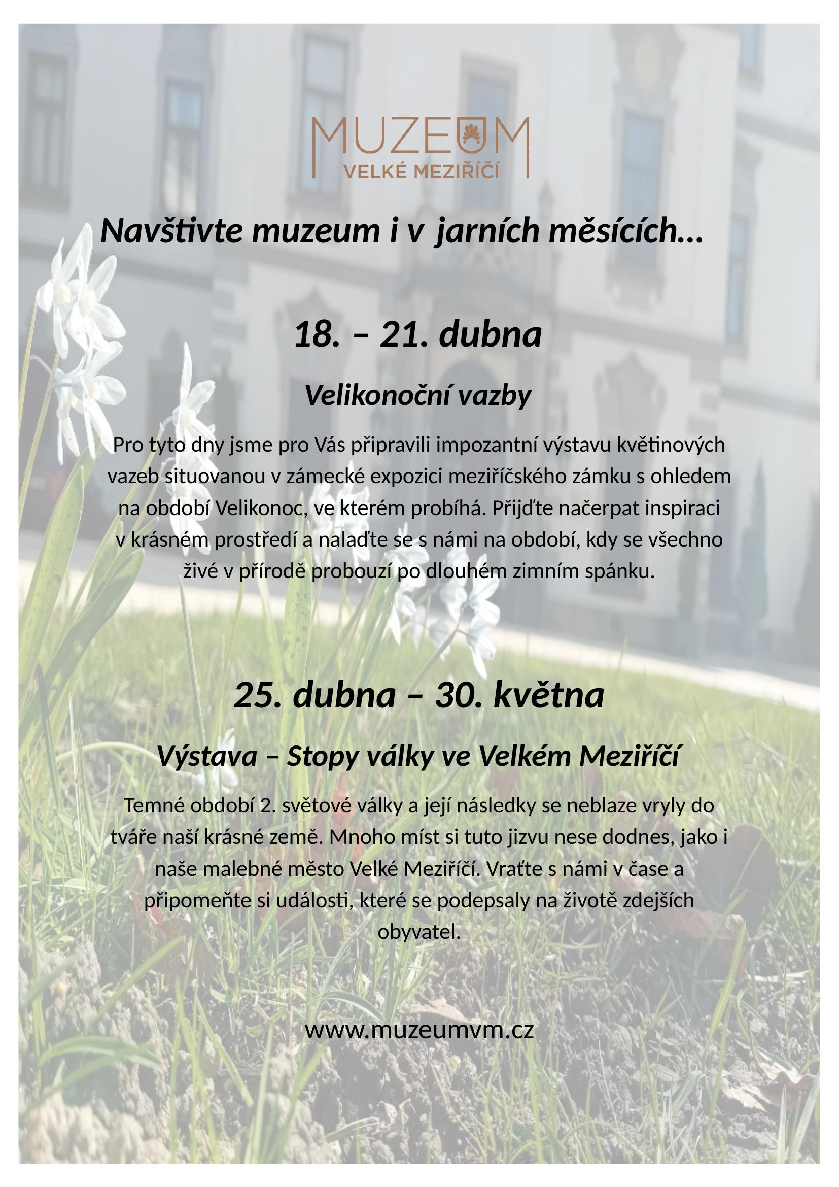 Všichni jste srdečně zváni na výstavu, která zachycuje temné období 2. světové války a její následky, které se neblaze vryly do tváře naší krásné země. Mnoho míst si tuto jizvu nese dodnes, jako i naše malebné město. Vraťte se s námi v čase a připomeňte si události, které se podepsaly na životě zdejších obyvatel.