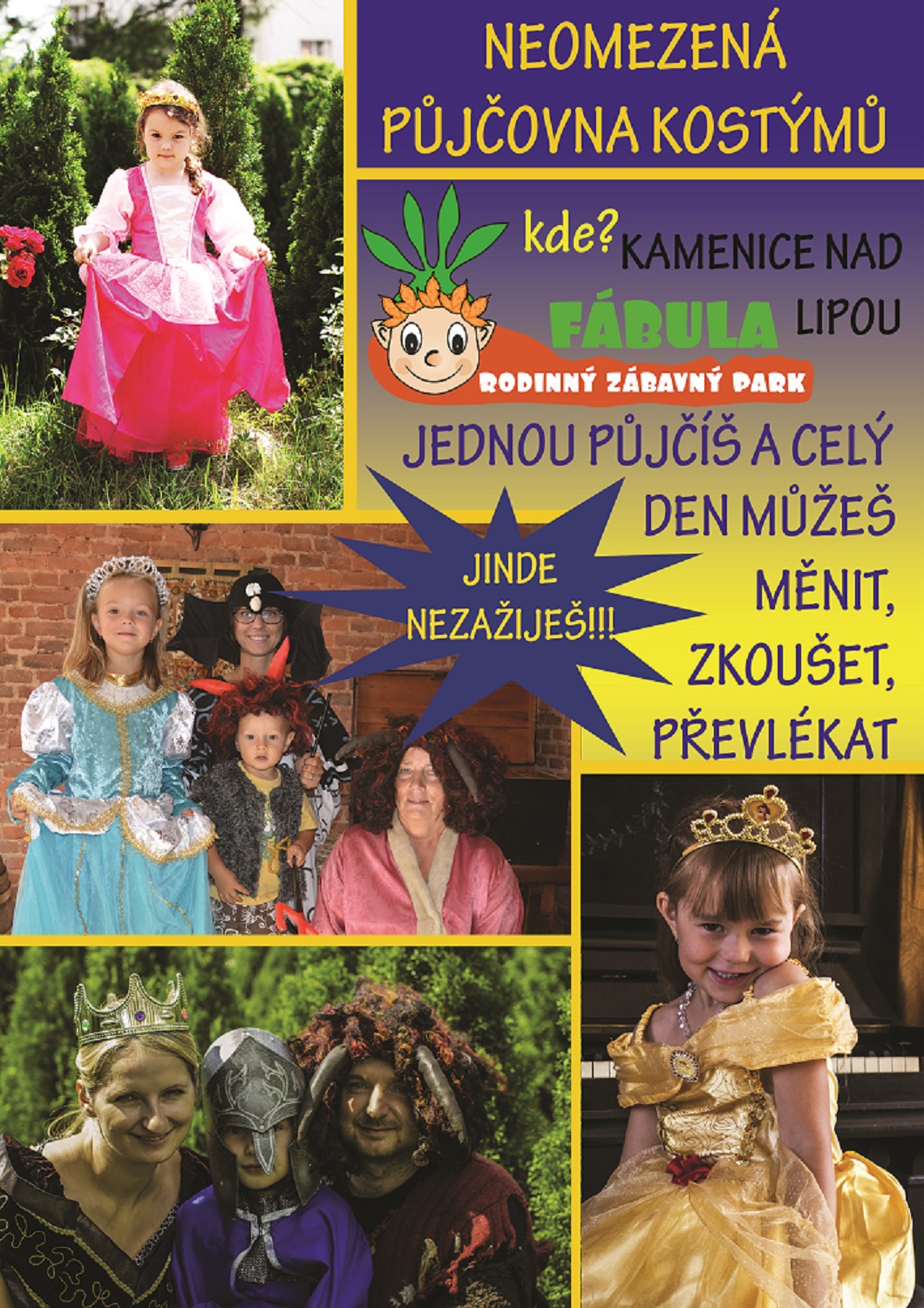 Neomezená půjčovna kostýmů v ceně jednoho. Během jednoho dne se můžeš stát kýmkoliv chceš. To vše za půjčovné jednoho kostýmu. Chceš nosit brnění? Nebo se snad cítit jako čaroděj, princezna, drak, kostlivec? Tak přijeď do parku Fábula a jdi do toho!