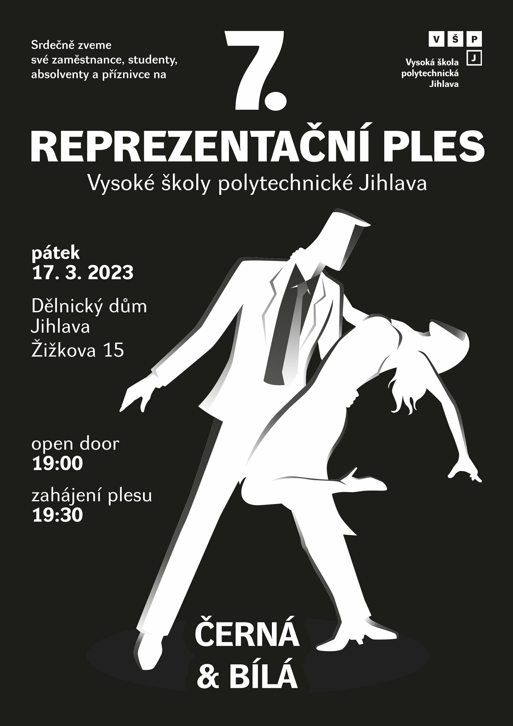 Srdečně Vás zveme na 7. reprezentační ples VŠPJ s podtitulem Černá & bílá, o kterém rozhodli svým hlasováním studenti a zaměstnanci školy.