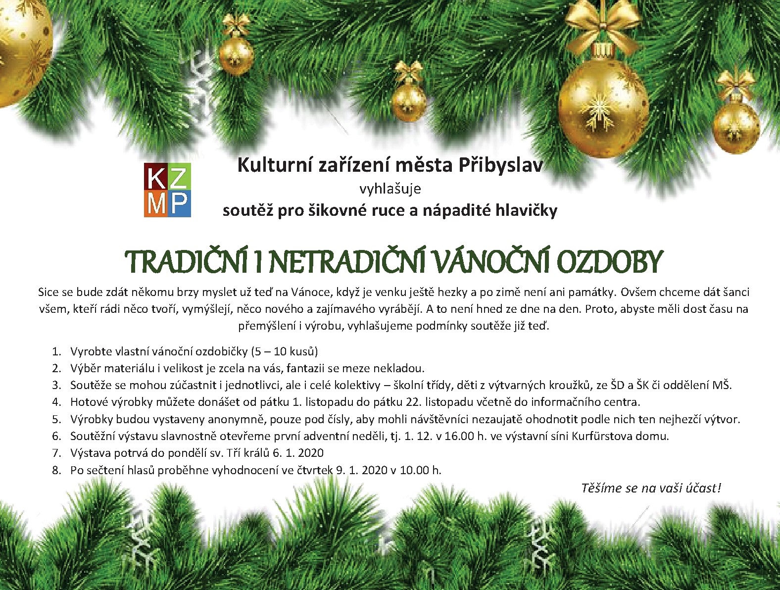 Kulturní zařízení města Přibyslav vyhlašuje soutěž pro šikovné ruce a nápadité hlavičky. Téma výstavy bude Tradiční i netradiční vánoční ozdoby. Vaše ozdoby můžete nosit do Infocentra v Přibyslavi od 1. listopadu do 22. listopadu. Soutěžní výstava bude otevřena 1. prosince v 16.00 h. a potrvá až do 6. ledna 2020. Vyhodnocení soutěže proběhne 9. ledna 2020 v 10.00 h.
