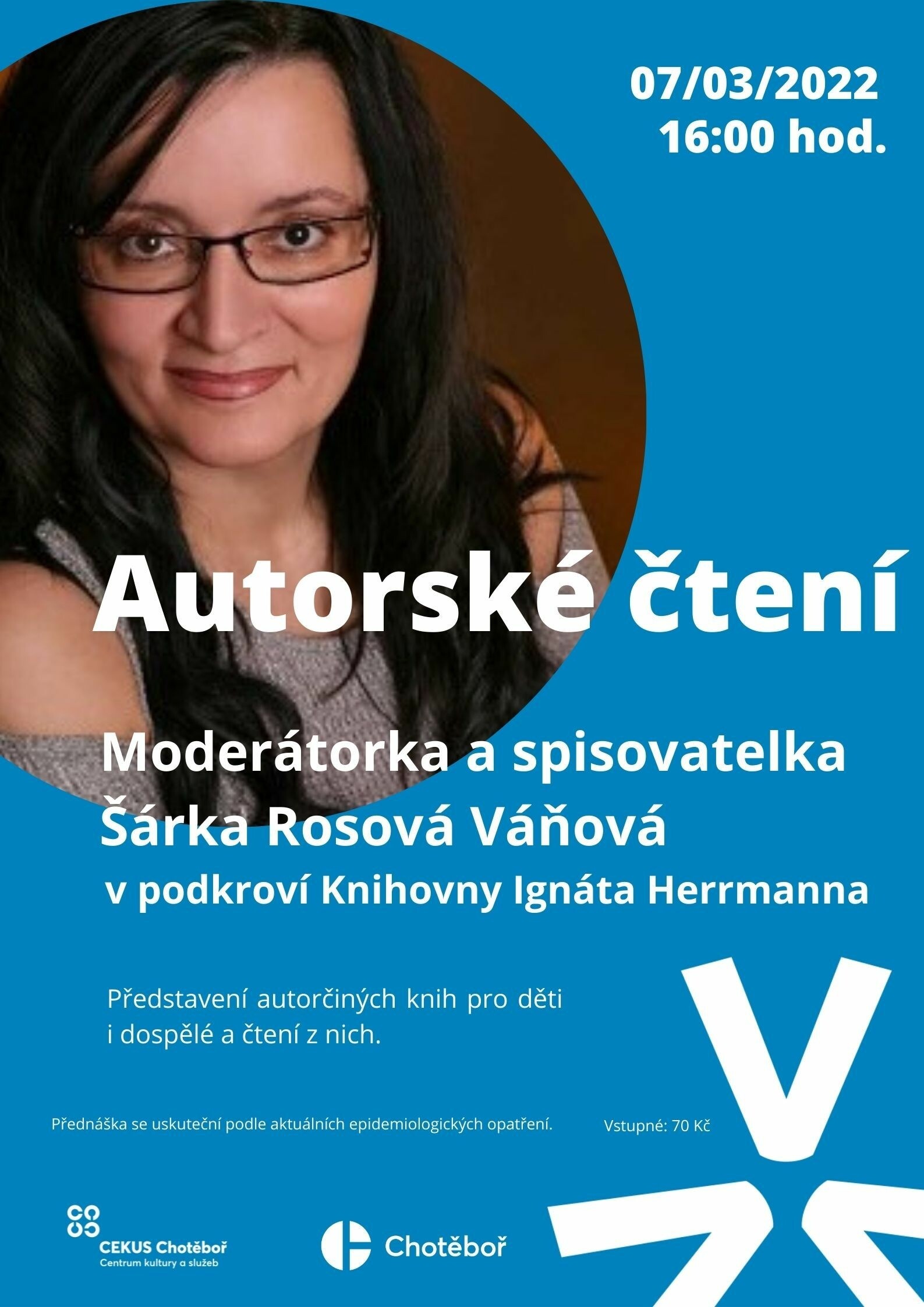 Autorské čtení moderátorky a spisovatelky Šárky Rosové Váňové, představení autorčiných knih pro děti i dospělé a čtení z nich, vstupné 70 Kč.