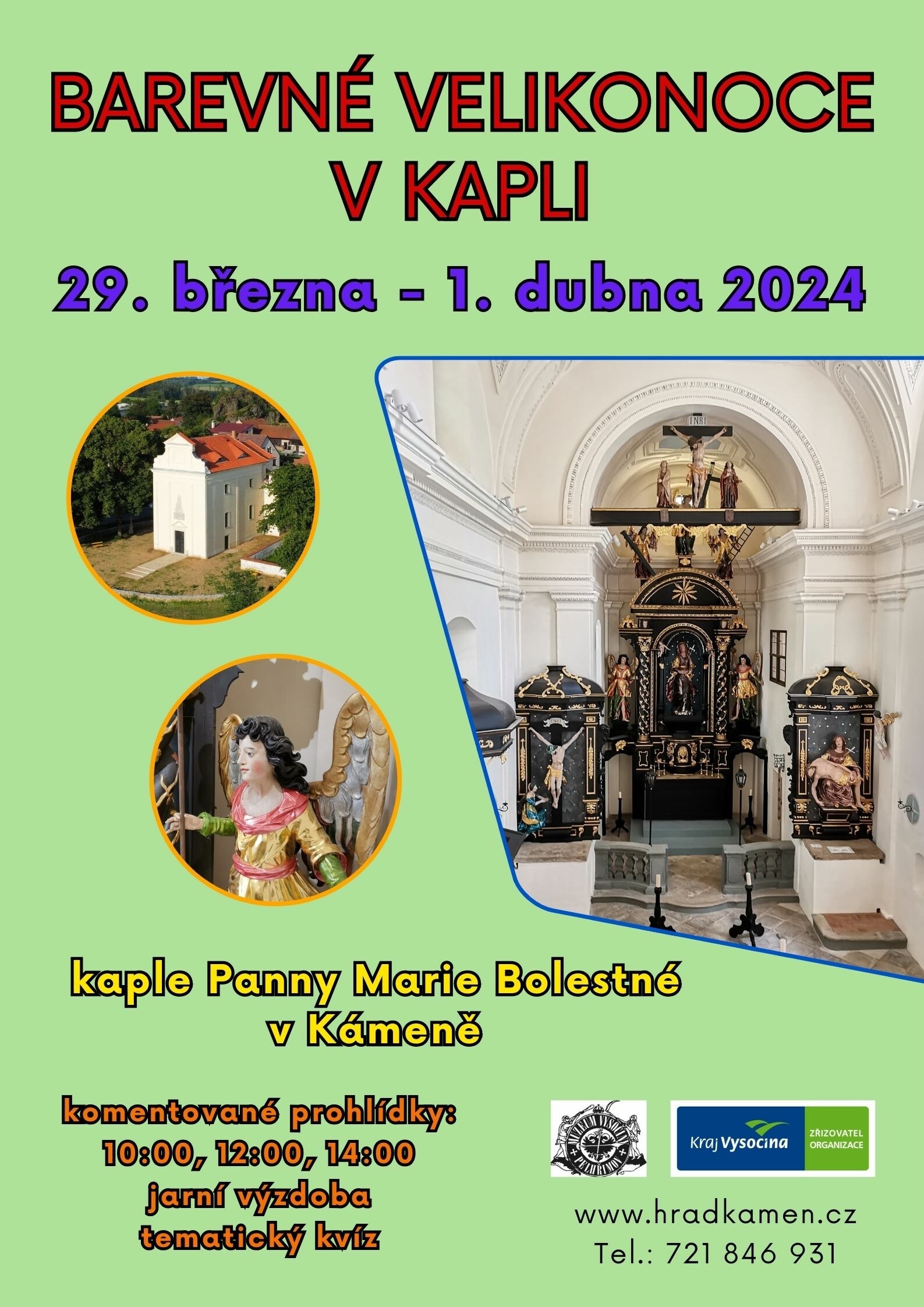 Muzeum Vysočiny Pelhřimov, p. o. všechny srdečně zve na zahájení 3. návštěvnické sezóny v kapli Panny Marie Bolestné v Kámeně, a to v období velikonočních svátků od pátku 29. 3. do pondělí 1. 4. 2024.
