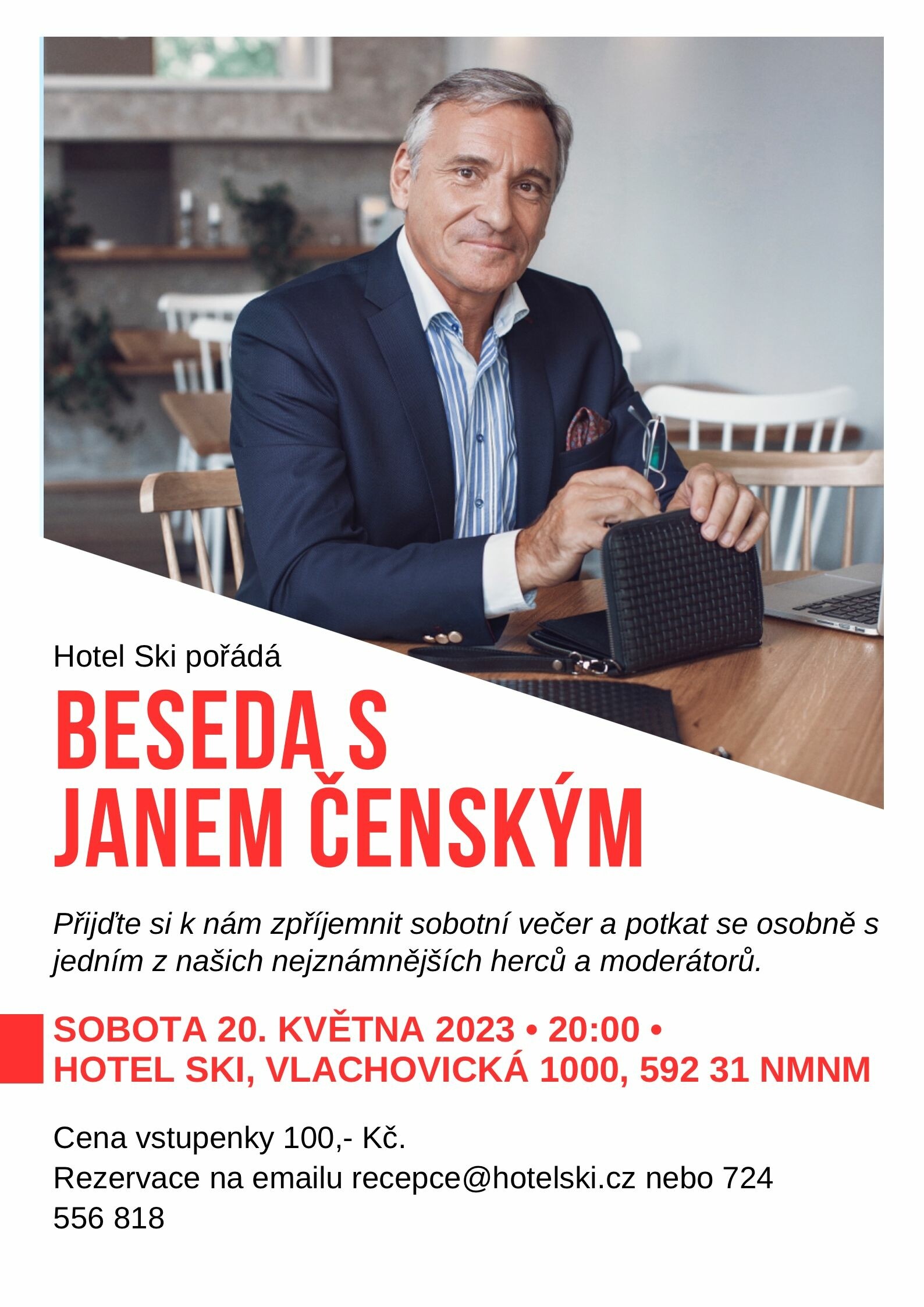 Hotel Ski pořádá v sobotu 20. května Besedu s Janem Čenským. Přijďte si zpříjemnit večer s jedním z našich nejznámějších herců a moderátorů.