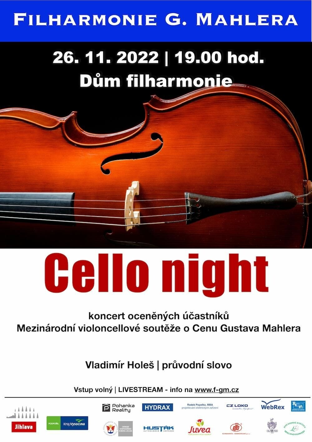 Vstup volný. Koncert bude přenášen přímým přenosem na kanálu Filharmonie G. Mahlera.