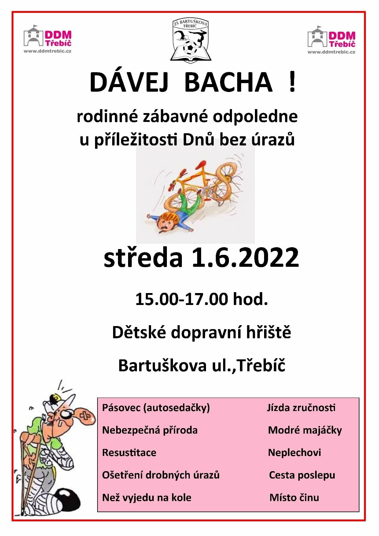Rodinné zábavné odpoledne u příležitosti Dnů bez úrazů. Vyzkoušíte jízdu zručnosti, ošetření drobných úrazů, cestu poslepu, ad.