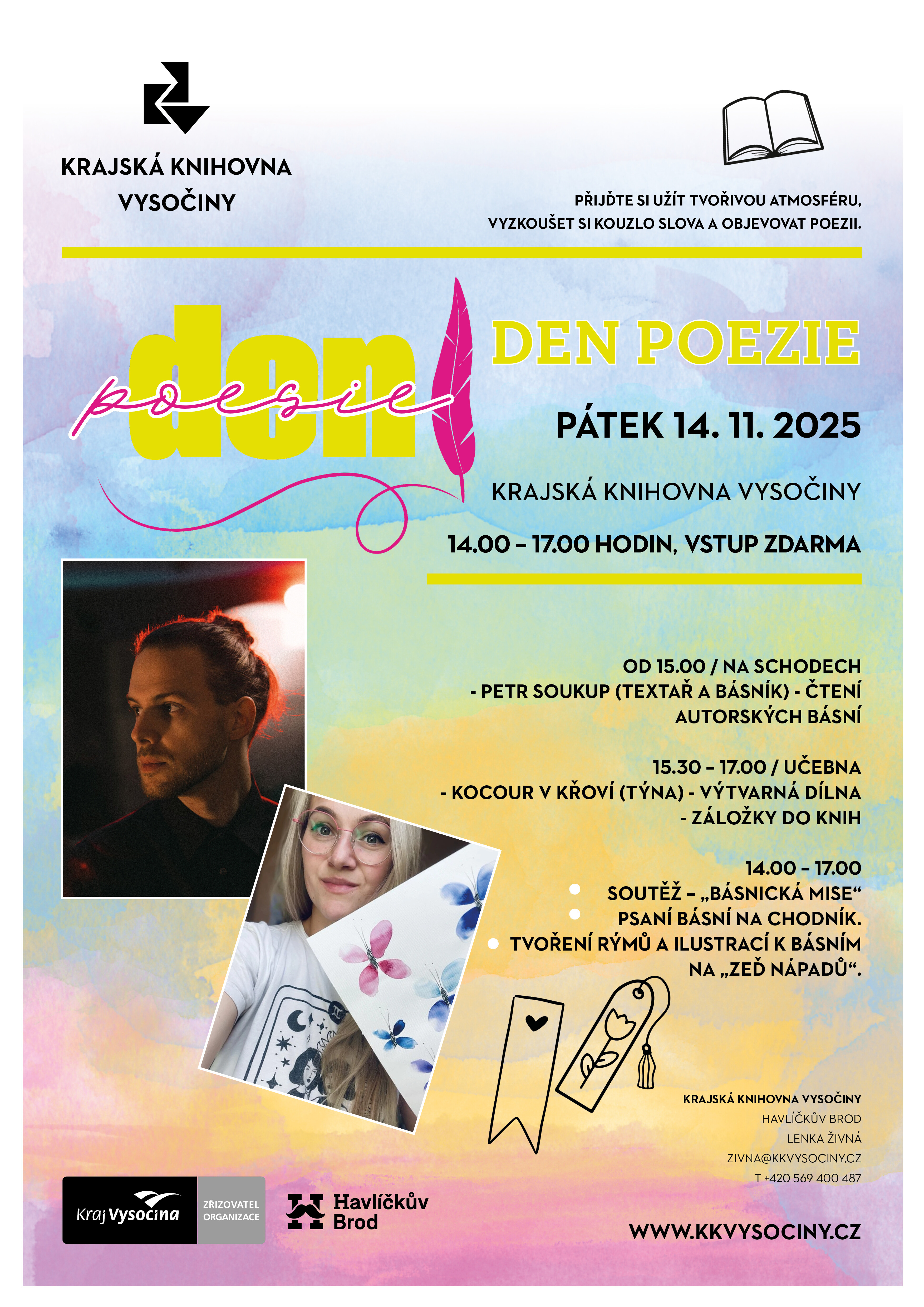 Zveme všechny malé i velké milovníky veršů na Den poezie. Odpolední program bude věnován soutěžím plným básniček, rýmů a jazykových hříček. Přijďte si užít tvořivou atmosféru, vyzkoušet si kouzlo slova a objevovat poezii zábavnou formou. Program: 14:00 - 17:00 soutěž Básnická mise, psaní básní na chodník, tvoření rýmů a ilustrací...