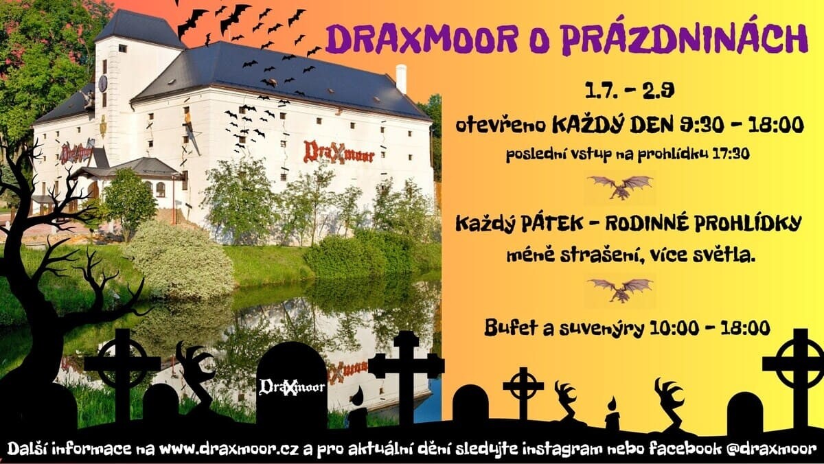 Od 1.7 - 2.9. bude mít Draxmoor o prázdninách otevřeno každý den od 9:30 - 18:00, poslední vstup na prohlídku je 17:30.