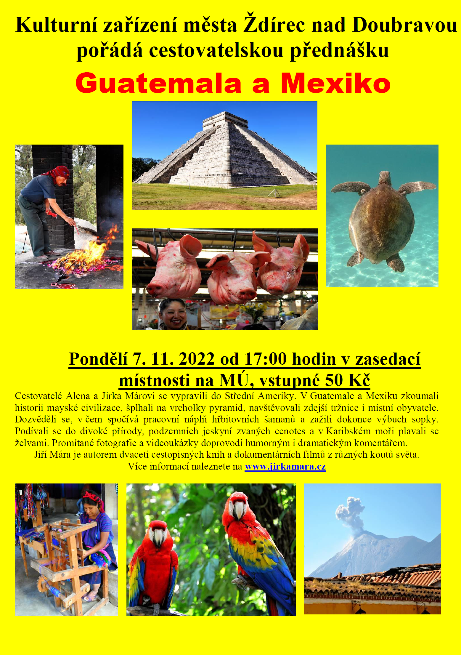 Guatemala a Mexiko - Cestopisná přednáška v pondělí 7. 11. 2022 od 17.00 hodin v zasedací místnosti Městského úřadu ve Ždírci nad Doubravou, Školní 500. Přednášející Jiří Mára, vstupné 50 Kč.