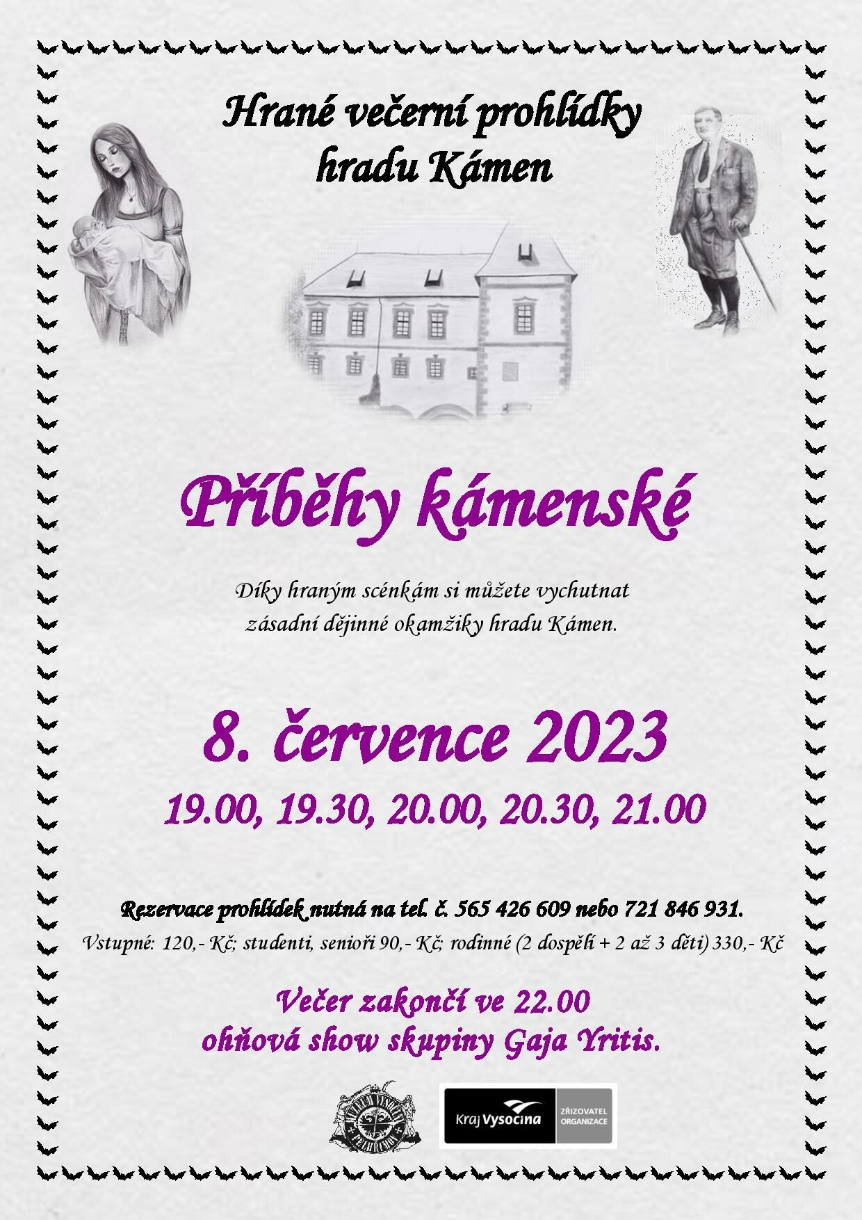 Čas od času hradem bloudí duch zazděné šlechtičny. V minulosti tu patrně vznikla penězokazecká dílna nebo tajné podzemní chodby. Jak dopadla vdova po Janu Kryštofu Malovcovi z Malovic? A jak bolestné muselo být vyvlastňování hradu pro Antonína Fleissiga? Díky hraným scénkám mohou návštěvníci zhlédnout zásadní dějinné okamžiky hradu Kámen. Prohlídky budou začínat v časech 19.00, 19.30, 20.00, 20.30 a 21.00 hodin. Vstupné na večerní prohlídky činí 120,- Kč, snížené (studenti, senioři) 90,- Kč a rodinné (2 dospělí + 2 až 3 děti) 330,- Kč. Z důvodu omezené kapacity je nutné si večerní prohlídku zarezervovat na tel. čísle 565 426 609 nebo 721 846 931. Večerní program ve 22.00 hodin zakončí ohňová show v podání skupiny Gaja Yritis.