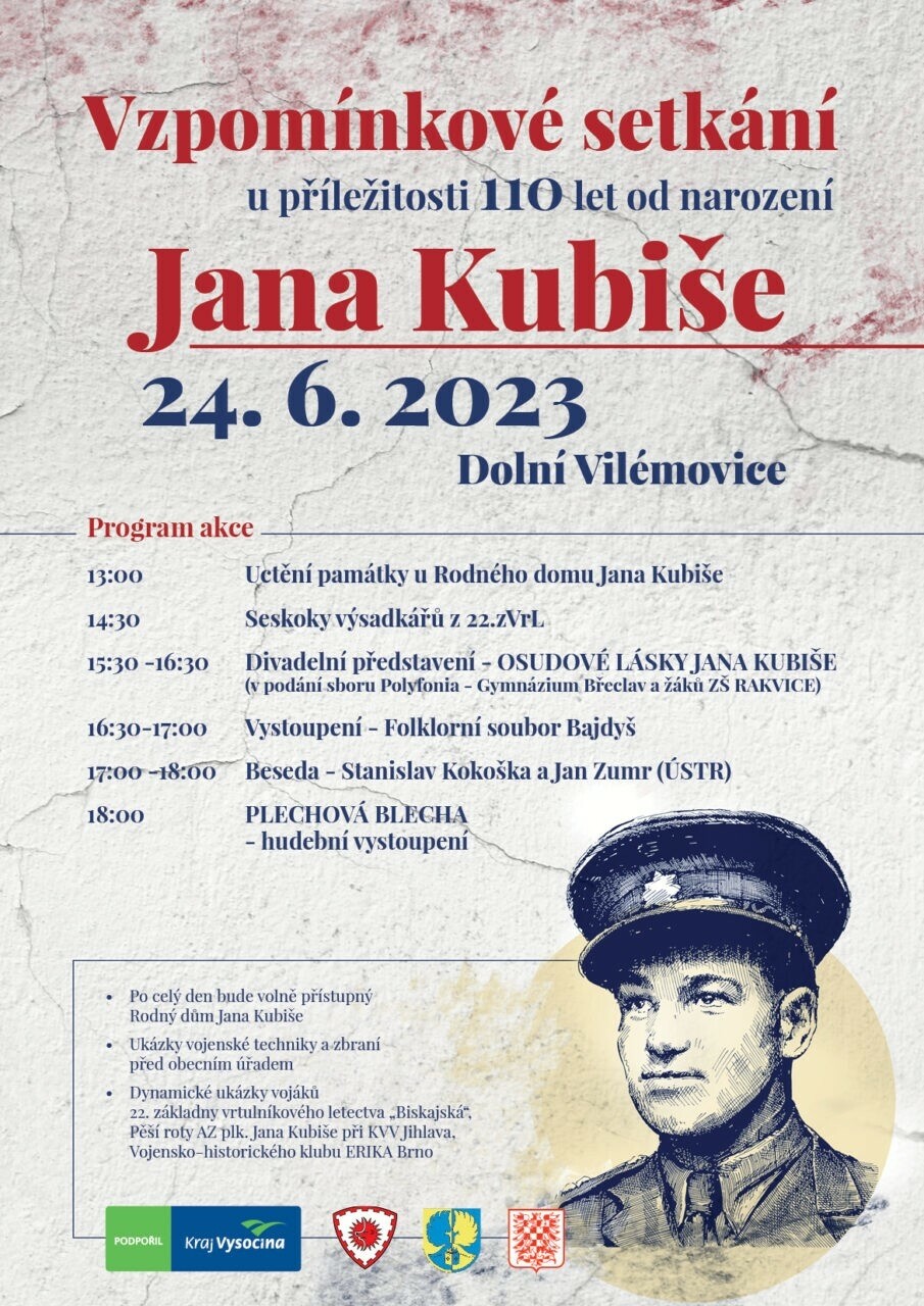 Po celý den bude volně přístupný Rodný dům Jana Kubiše, budou na vás čekat ukázky vojenské techniky a zbraní před obecním úřadem a dynamické ukázky vojáků 22. základny vrtulníkového letectva '' Biskajská'', Pěší roty AZ plk. Jana Kubiše při KVV Jihlava, Voljensko-historického klubu ERIKA Brno.