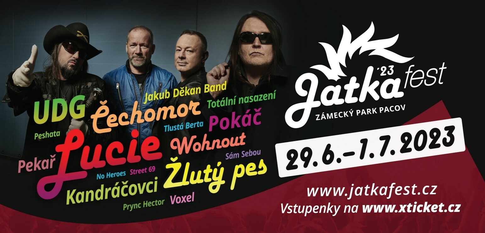 Hudební festival v Zámecké zahradě. Vystoupí: Lucie / Wohnout / Čechomor / Kandráčovci / Pokáč / Žlutý pes / UDG / Pekař / Peshata / Jakub Děkan / Totální Nasazení / Voxel / Sám sebou / Tlustá Berta / Prync Hector / No Heroes a další. Více na www.jatkafest.cz.
