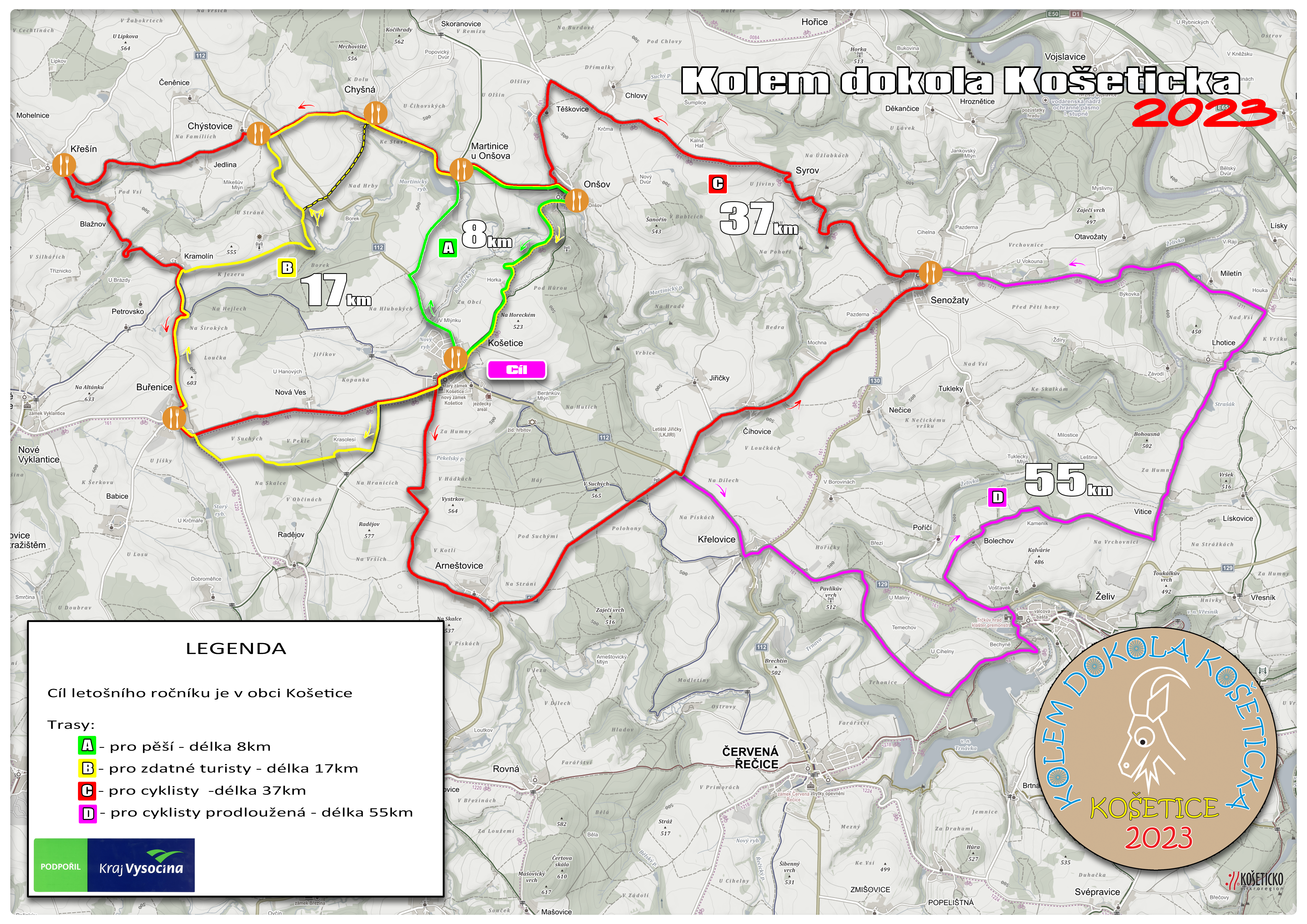 • Start akce: v kteroukoliv hodinu od 9:00 do 16:00 hod, z kterékoliv „občerstvovny"(Košetice, Onšov, Martinice, Chyšná, Chýstovice, Křešín, Buřenice)