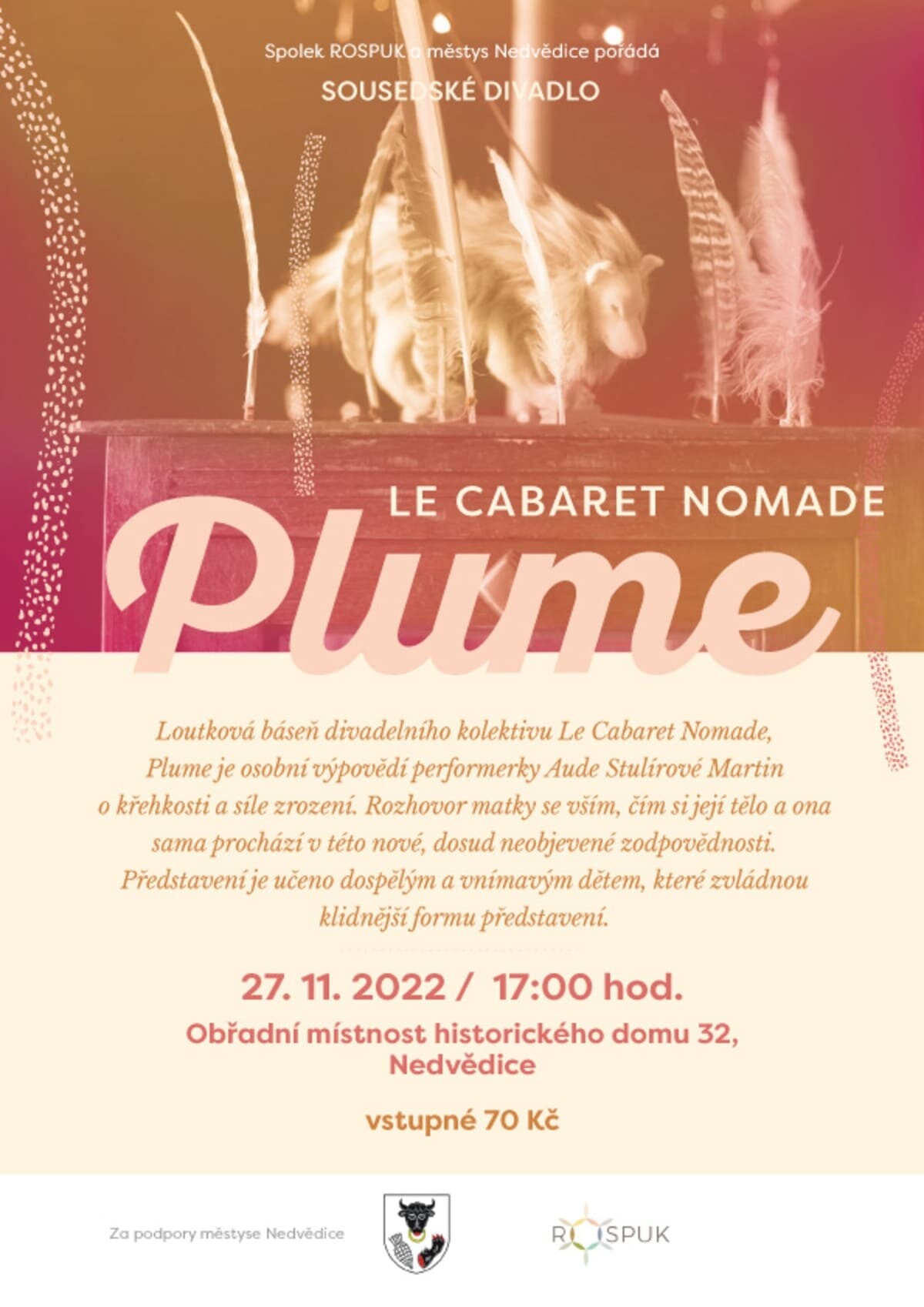 Loutková báseň divadelního kolektivu Le Cabaret Nomade, Plume je osobní výpovědí performerky Aude Stulírové Martin o křehkosti a síle zrození.