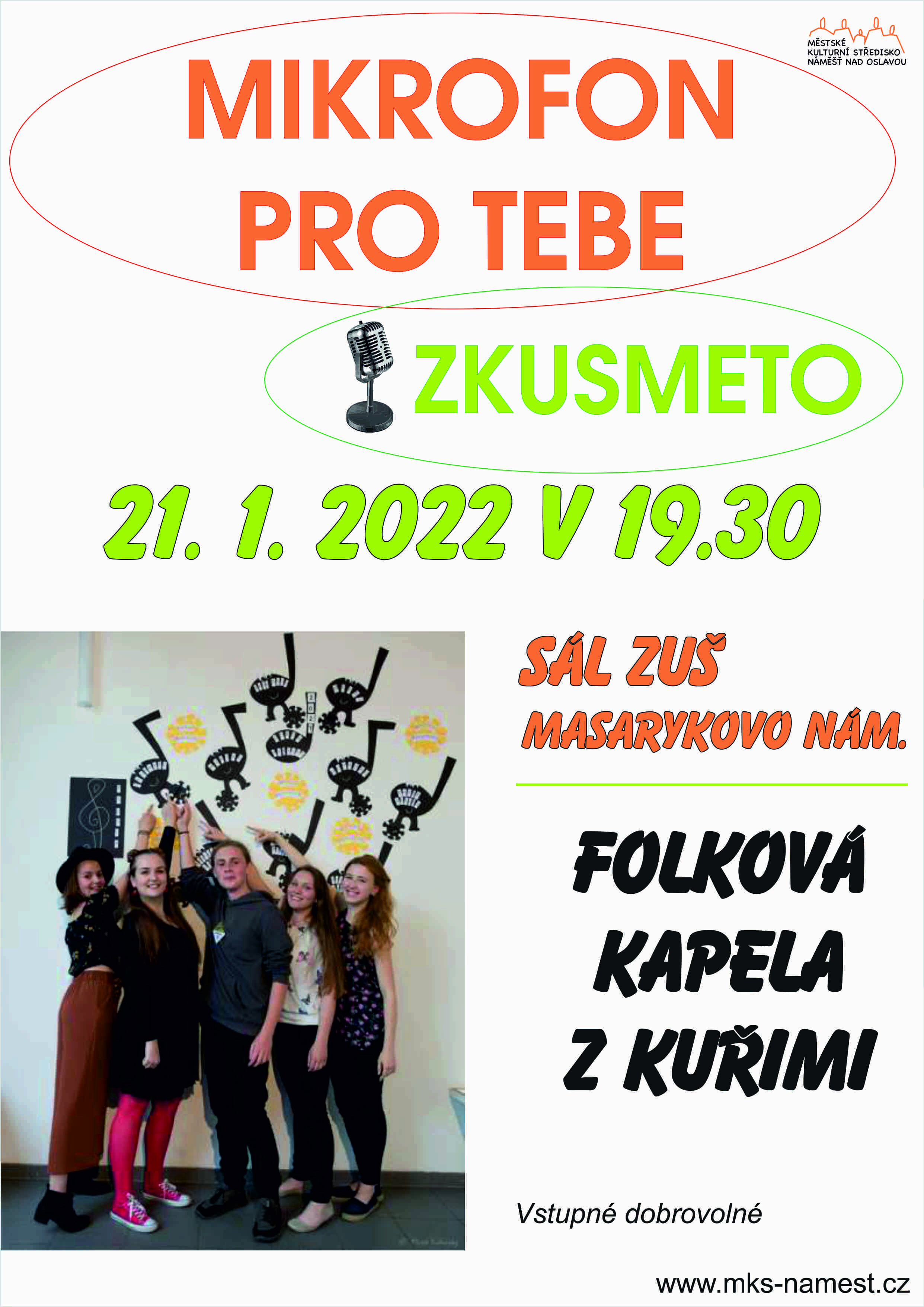 Koncert z cyklu Mikrofon pro tebe skupiny ZKUSMETO, který se měl konat v pátek 21. 1. v sále ZUŠ na Masarykově náměstí, musíme pro nemoc ZRUŠIT. Děkujeme za pochopení.