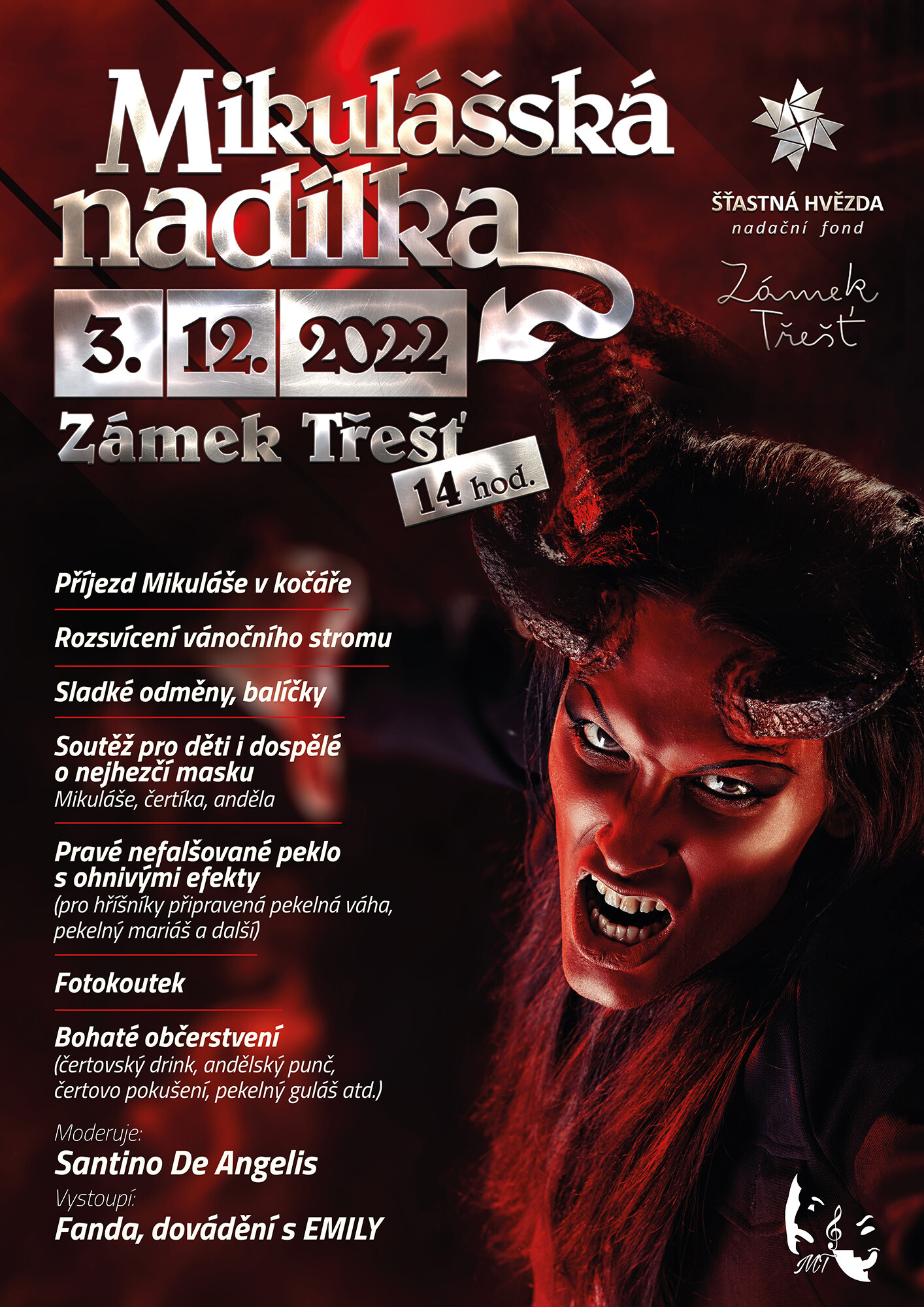 V sobotu 3. prosince 2022 se můžete těšit na Mikulášskou nadílku a čertovské dovádění na Zámku v Třešti. Akce se koná ve spolupráci s naším partnerem, nadací Šťastná hvězda, začíná ve 14:00.