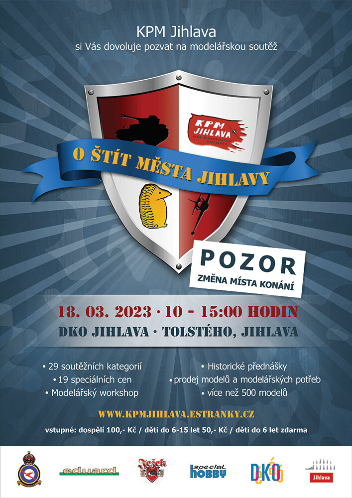 Dovolujeme si Vás jako pořadatelé pozvat na tradiční soutěžní výstavu plastikových modelů "O Štít města Jihlavy", 48.ročník a 14. ročník Kit Show, která se bude konat v sobotu 18.3.2023 ve velkém tanečním sále DKO Jihlava, Tolstého 2, Jihlava.