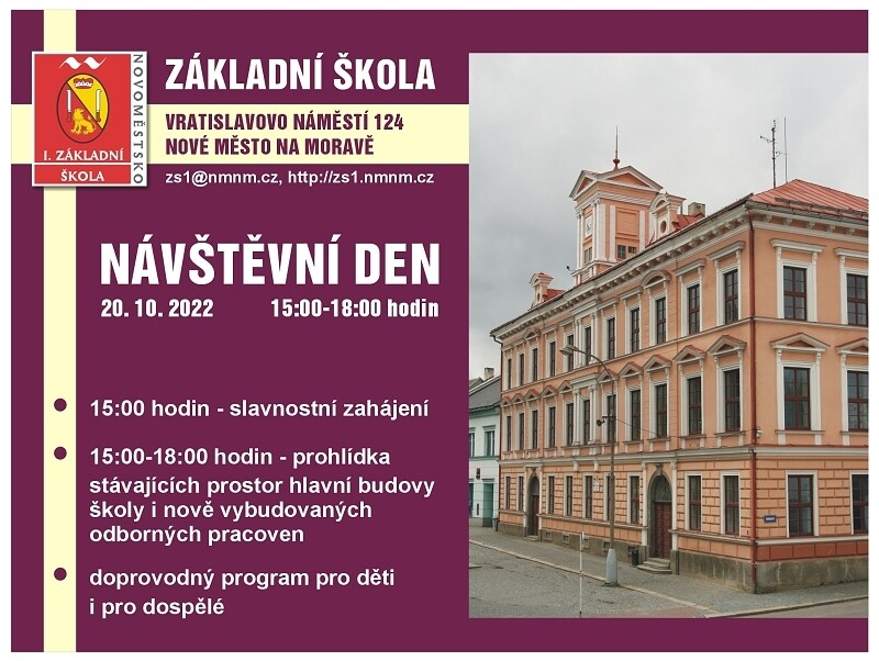 Zveme širokou veřejnost k prohlídce 1. základní školy. Zpřístupněny budou stávají prostory, ale také nově vybudované odborné učebny, které vznikly nástavbou nad tělocvičnou a jídelnou. Slavnostní zahájení proběhne v 15:00 hodin a prohlídka potrvá do 18:00 hodin. Součástí bude bohatý doprovodný program pro děti i dospělé.