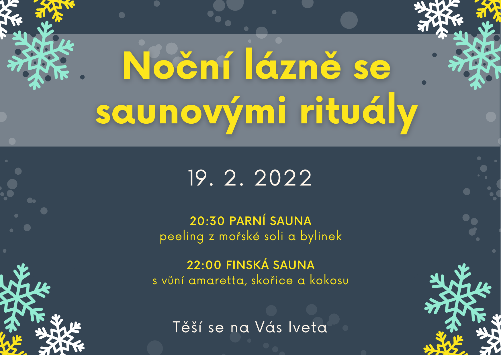Přijďte si užít romantickou atmosféru noční sauny nebo plavání - 19. 2. budeme mít otevřeno do 24:00 hod.