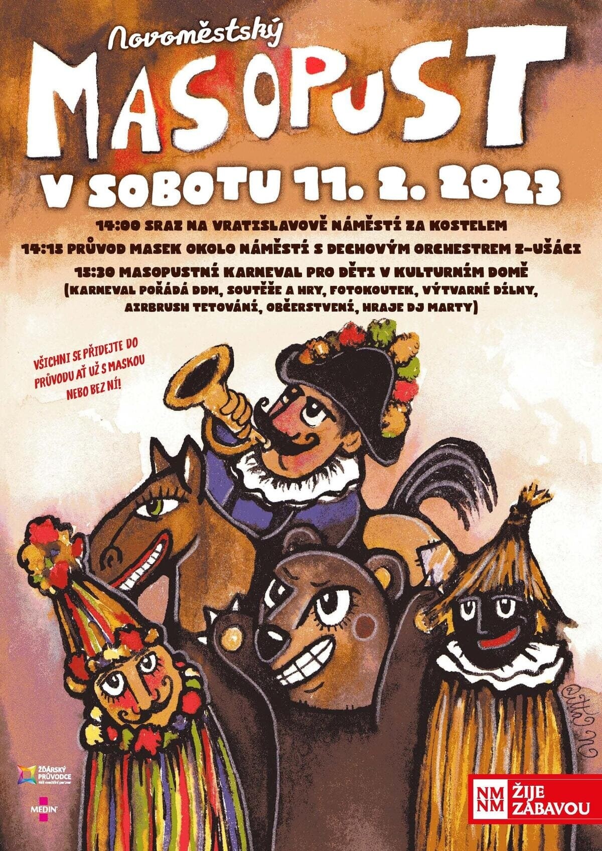 14:15 průvod masek okolo náměstí s dechovým orchestrem z-ušáci
