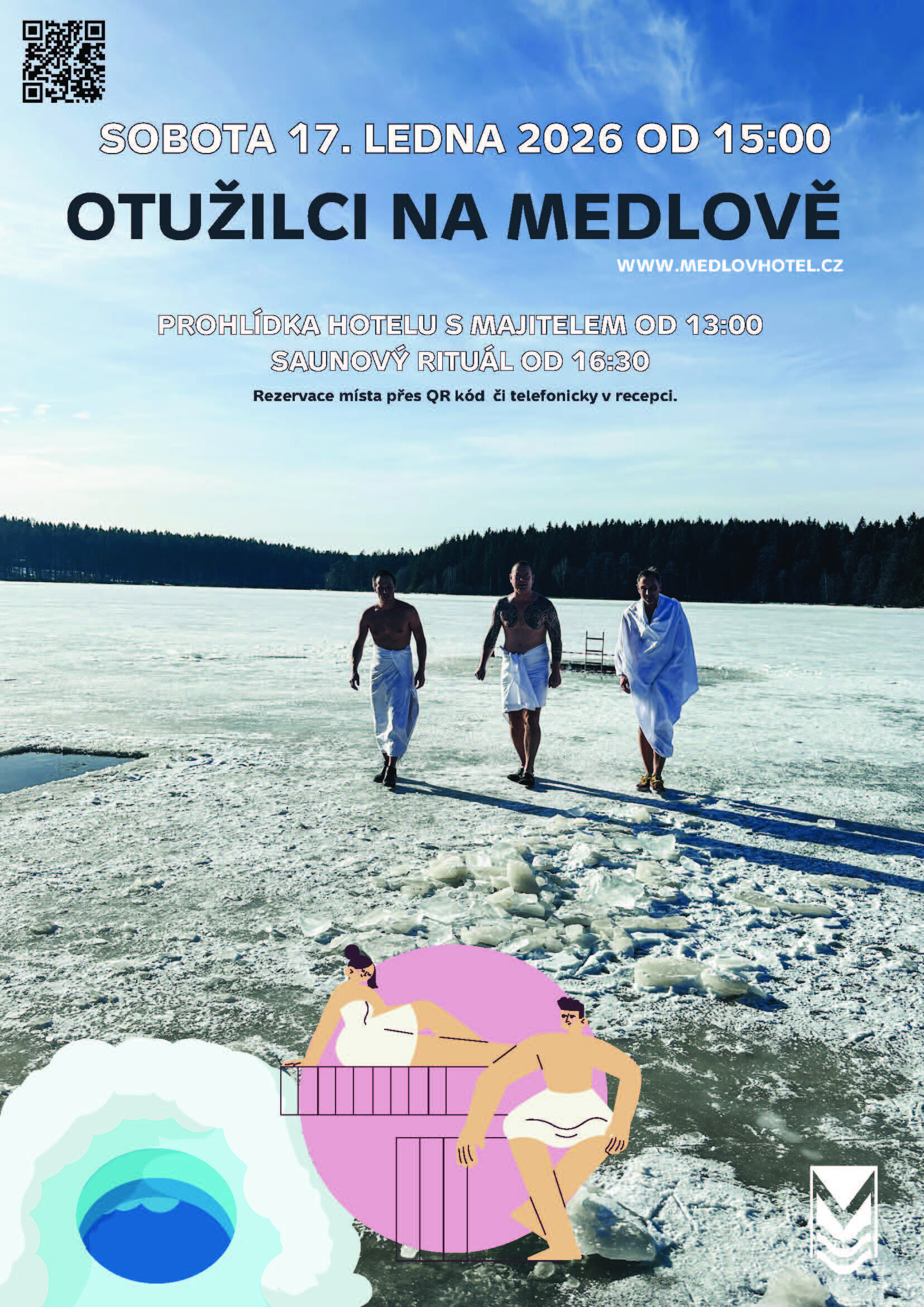 ...nás v rybníce se stále někdo čvachtá a my jsme se rozhodli, že tento zdraví přínosný kolorit zvolíme za druh společenského setkávání. Srdečně Vás tedy zveme na třetí ročník akce Otužilci na Medlově a jsme sami zvědaví na to, kolik se nás tentokrát sejde. Odměnou nejen pro odvážlivce, ale i pro případné publikum, budiž následný saunový rituál, který bude probíhat od 16:30 hodin. A aby toho programu nebylo málo, od 13:00 se můžete zúčastnit i první prohlídky hotelu s majitelem v roce 2025. Tak neváhejte, plavky s sebou a připojte se k nám. Začínáme v 15.00 srazem na břehu rybníka.