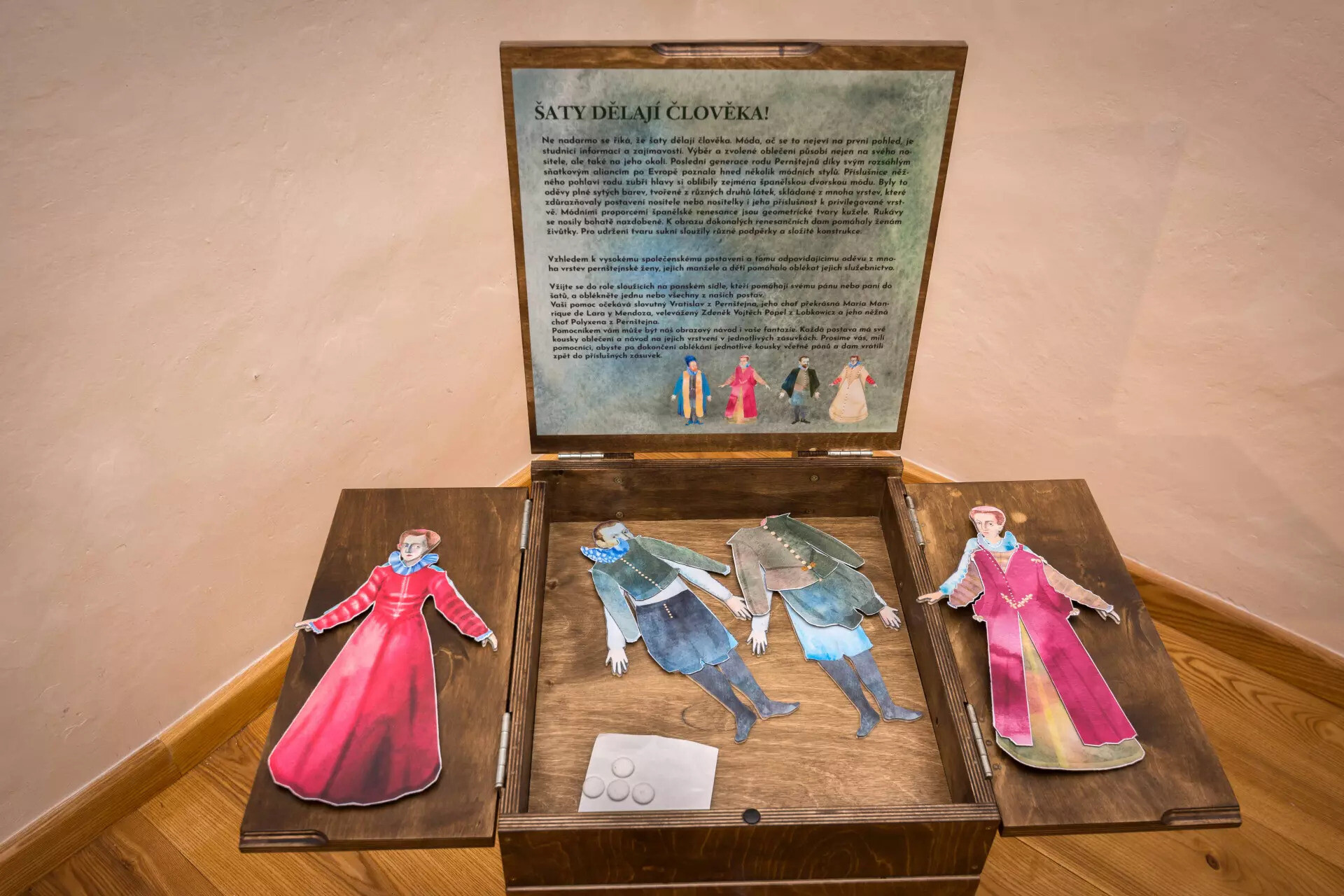 Nejen dětem je určena zážitková část výstavy. Vyzkouší zapeklitosti oblékání tehdejší módy, náročnost psaní dobovým písmem nebo výrobu parfému. Do vztahů mezi jednotlivými příslušníky rodu proniknou v aktivitě nazvané Pernštejnský salon.