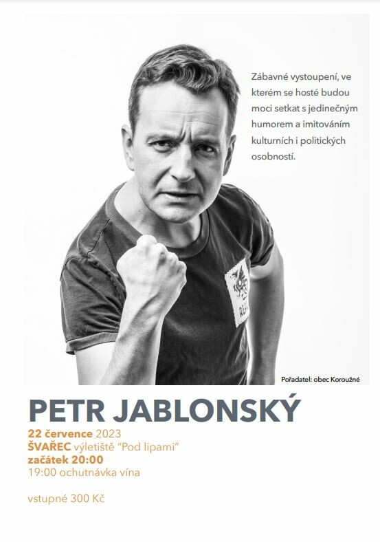 Zábavené vystoupení Petra Jablonského, plné humoru a imitací, se uskutční 22. června na výletišti "Pod lipami" ve Švařci.