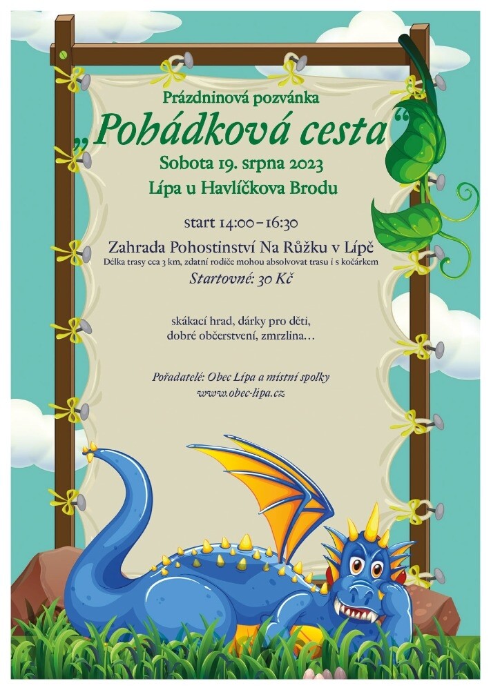V sobotu 19. srpna 2023 odpoledne se přijeďte s dětmi podívat do Lípy u Havlíčkova Brodu na velkou pohádkovou cestu. Start na trasu je od 14:00 do 16:00 hodin u zmrzliny „Na Růžku" v Lípě.