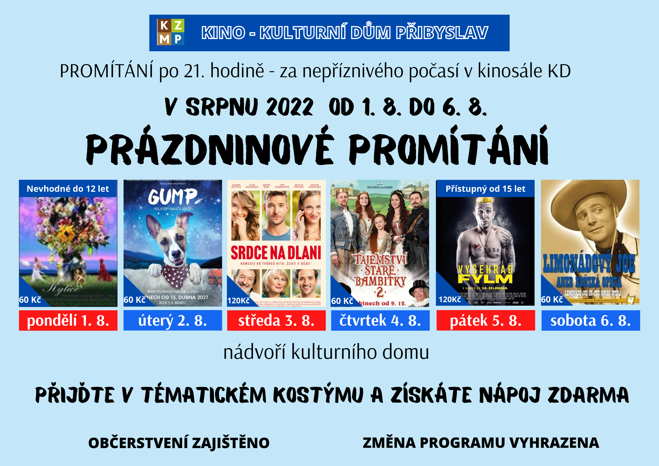 Na prázdniny jsme si pro Vás připravili Prázdninové promítání u nás v areálu kulturního domu. Svůj oblíbený film si určitě najdou děti i dospělí. Začínáme vždy ve 21.00 hodin. Na všechny se moc těšíme. Taková třešnička na dortu, kdo přijde v tématickém kostýmu k danému filmu získává nápoj zdarma :-)...