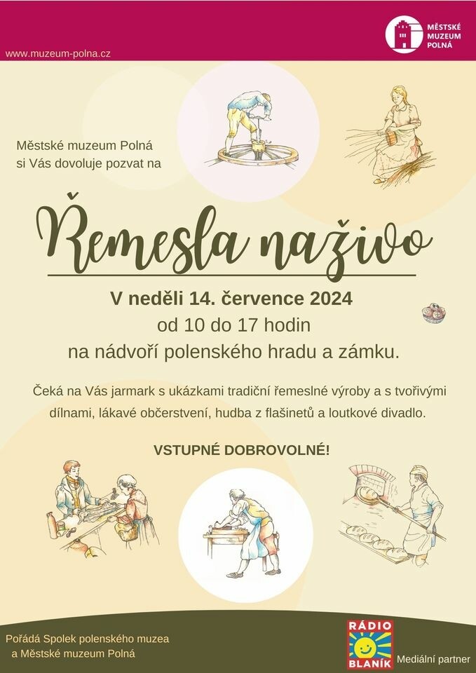 Stará řemesla, jarmark, dílny, oživená expozice řemesel, komentované prohlídky hradu a Staré školy, spousta dobrot, hudba z flašinetů a pohádka pro děti -TO JE NEDĚLE 14. 7. OD 10-17 HODIN NA Hrad Polná - těšíme se na Vás!