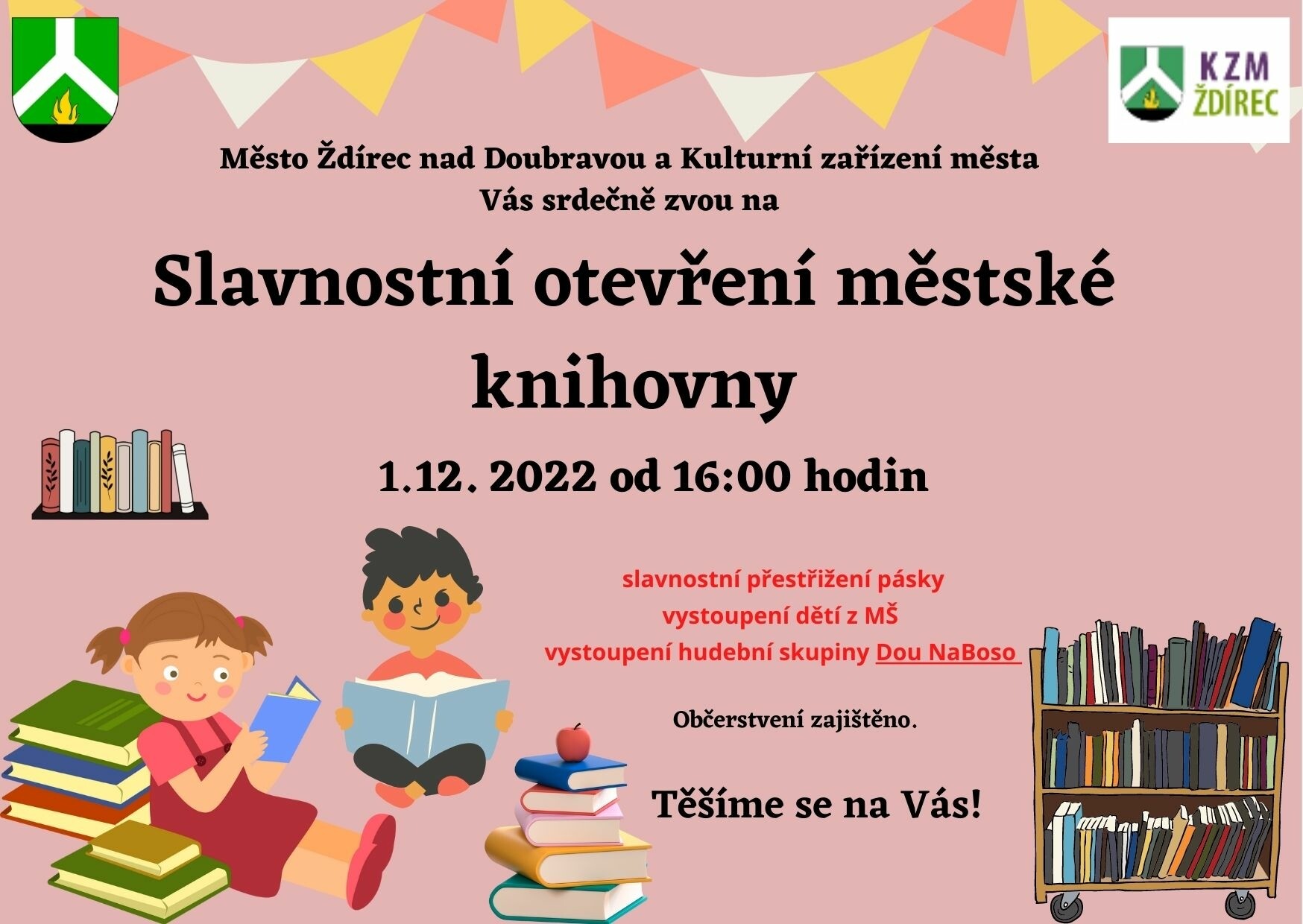 Město Ždírec nad Doubravou a Kulturní zařízení města srdečně zvou ve čtvrtek 1. 12. 2022 od 16.00 hodin na Slavnostní otevření městské knihovny. Slavnostní přestřižení pásky, vystoupení dětí z MŠ, vystoupení hudební skupiny Dou NaBoso. Občerstvení zajištěno! Těšíme se na Vás!