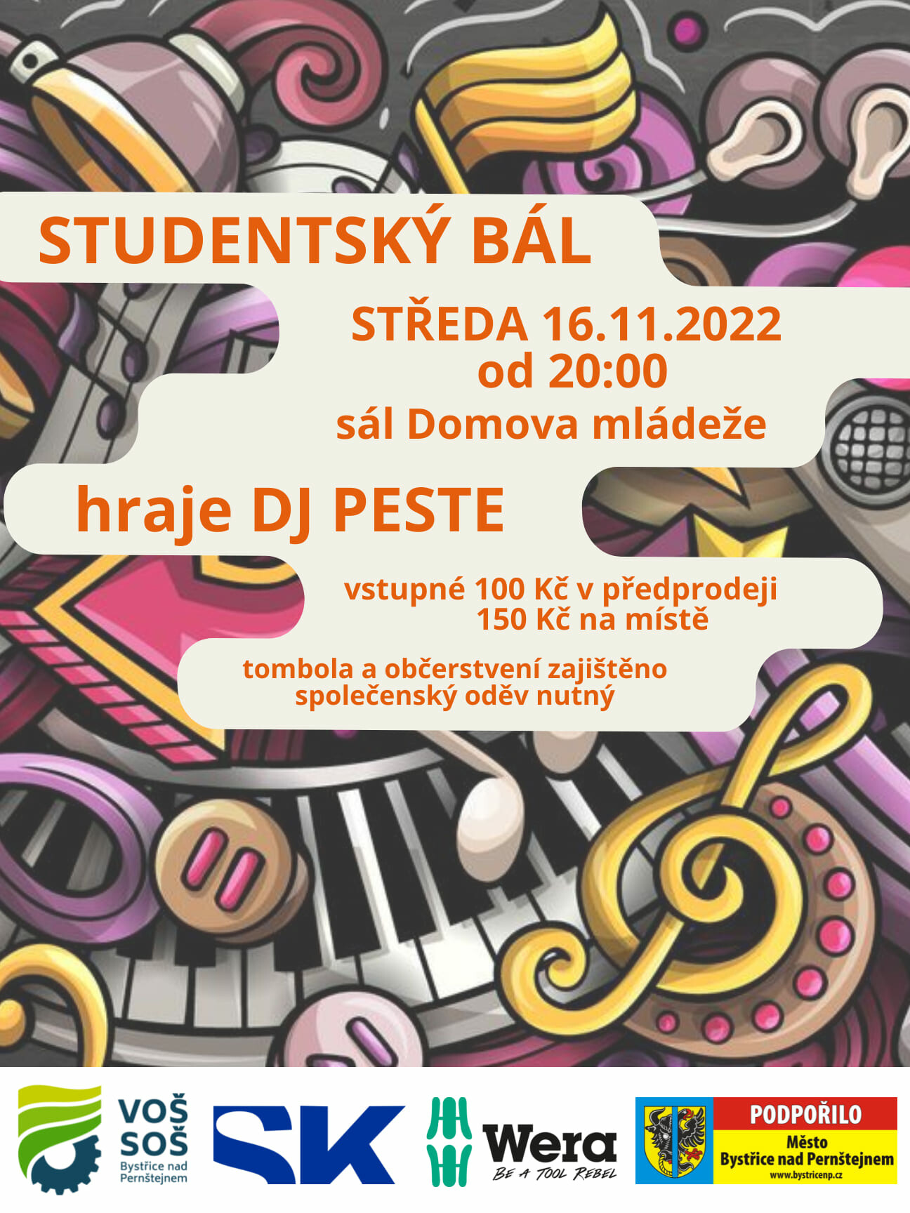 Zveme Vás na Studentský bál, který se uskutečení 16. listopadu od 20.00 hod. v sále Domova mládeže VOŠ a SOŠ. Hraje DJ Peste.